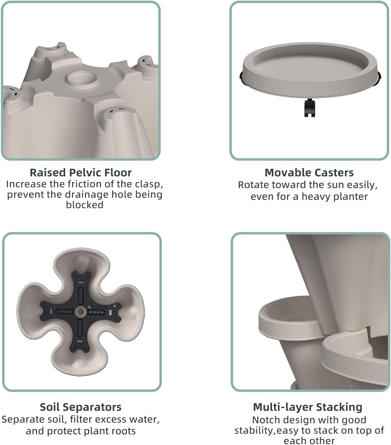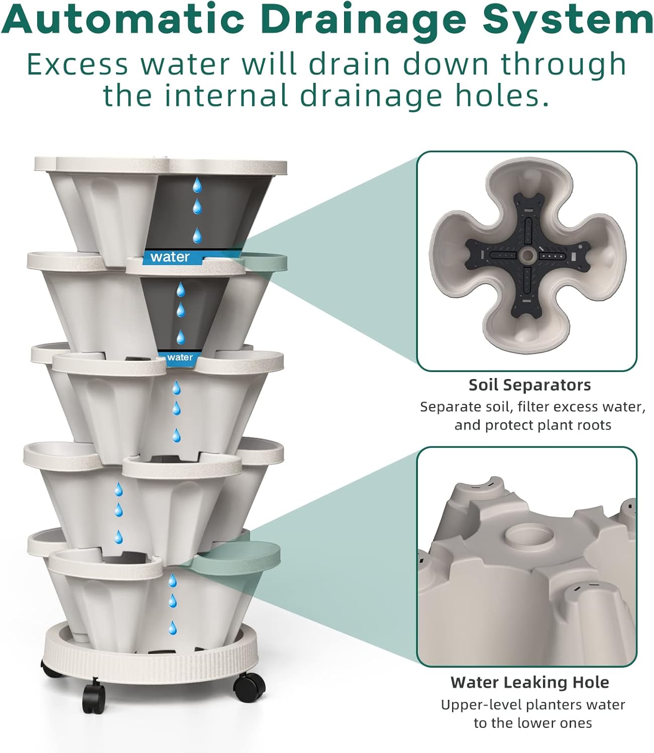 - Flow Design - The water filtration system from top to bottom can save water and retain moisture but prevents overwatering or root rot. 5 filters are placed on each level to keep the soil from going through the big drainage holes, it also helps retain water in each planter level.