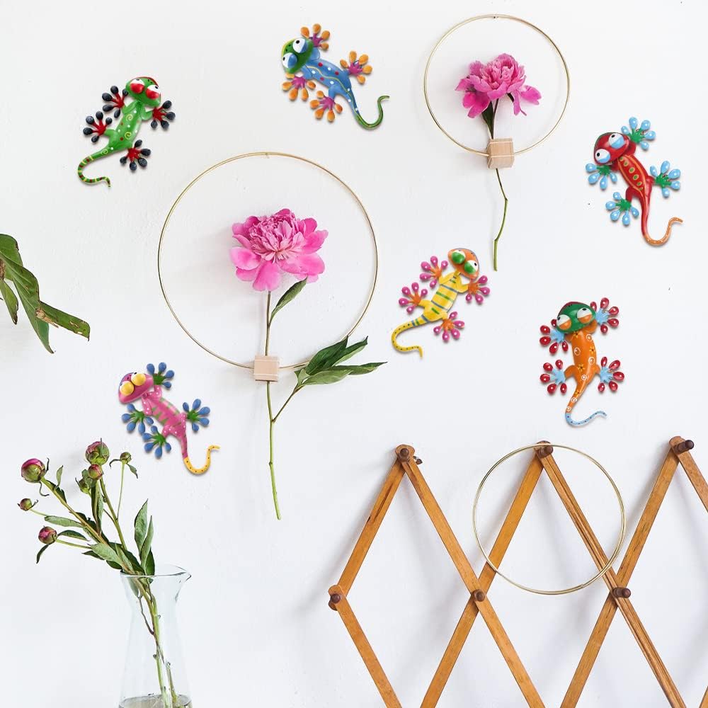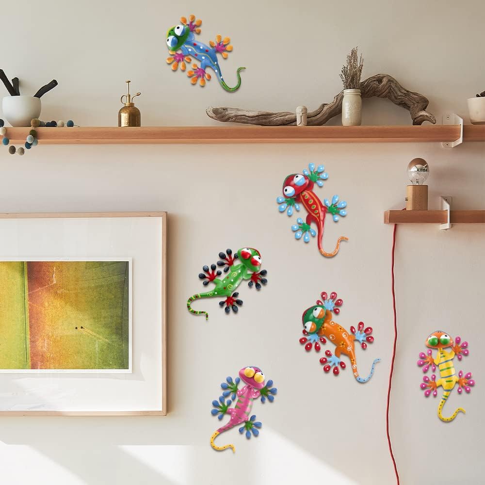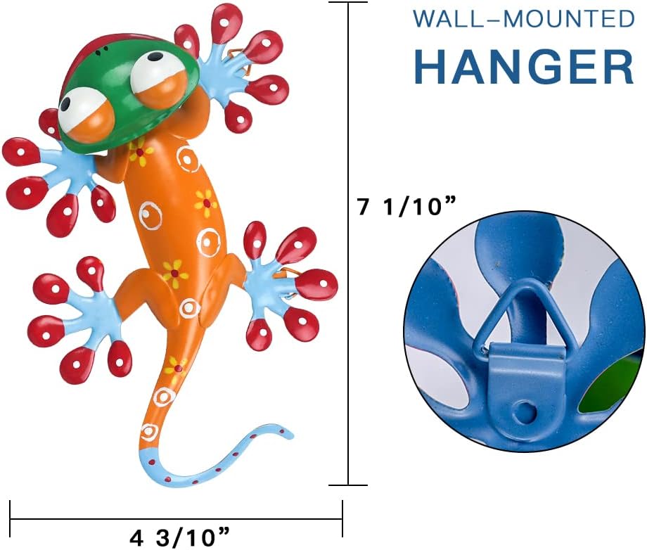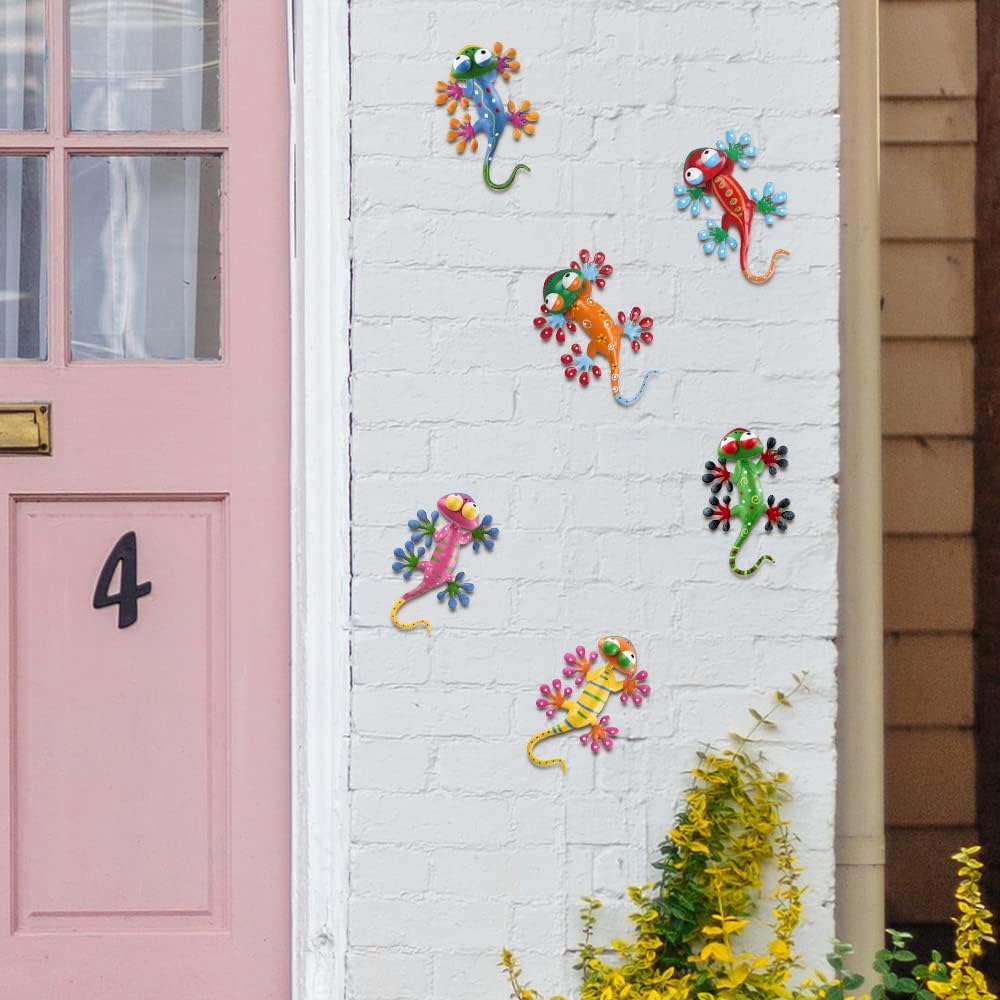 - 【ENLIVEN YOUR SPACE】- A set of 6 adorable metal gecko wall decorations. Bright colors add a little character to the flower garden and old fence. Irregular patterns and hand-painted colors make them look more exotic than real geckos. The beautiful cutting technique of the backyard decor art makes the lizards look lifelike. Measures 7 2/5x 4 1/3 x 4/5inches.
