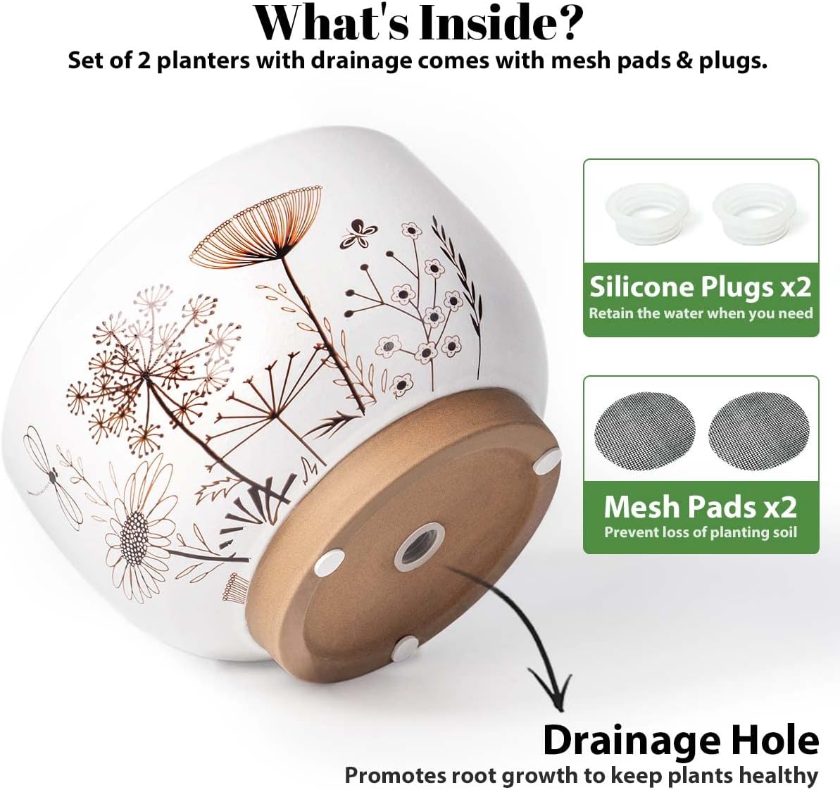 - 【2 DIFFERENT SIZES】Large plant pot: 7.87" D x 5.12 "H. Small plant pot: 5.91"D x 4.02"H. Package: contains 2 ceramic flower pots, 2pcs mesh pads & 2pcs silicone plug . (NOT INCLUDE PLANTS)