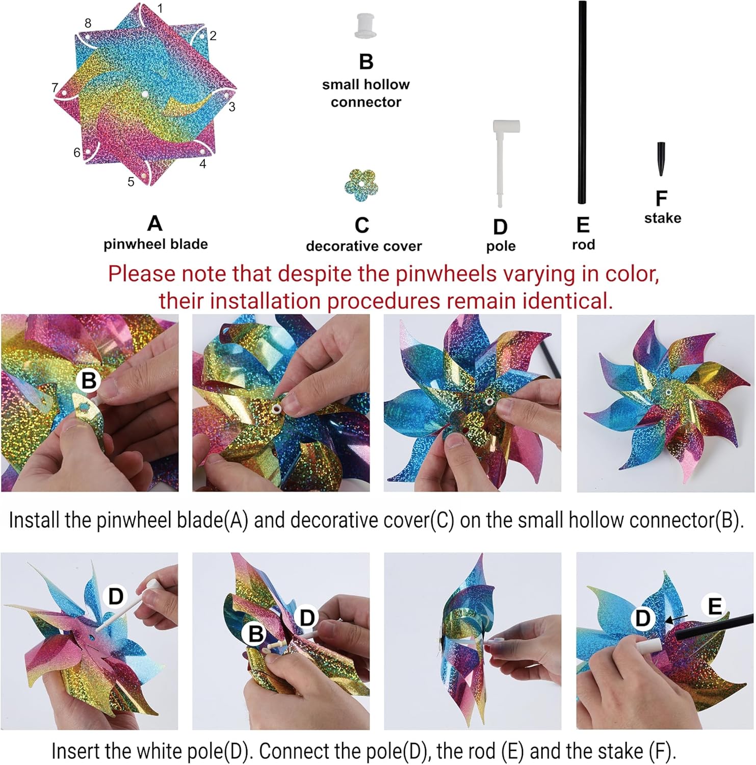 - Garden Decoration: Garden spinner pinwheel is 18.5 inches tall that enough to attract the attention of birds from a distance. They are so beautiful as they spin in the wind and reflect sunlight. These spinners work like any other holographic scare tape or scare rods, but they are also an elegant addition to your garden