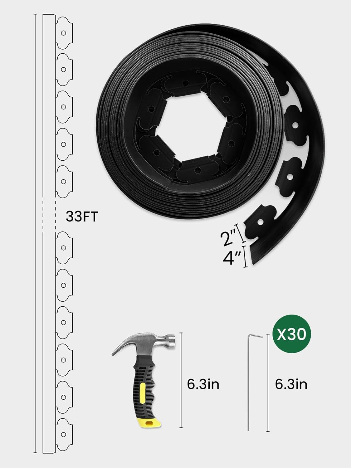 - ALL-IN-ONE KIT: the garden edging border comes with everything you need: 33 ft x 4 inch tall flexible edging for landscaping, 30pcs 6.3" galvanized steel spikes, and a 6.3" hammer. No need to prepare extra tools β start your landscaping project right out of the box.