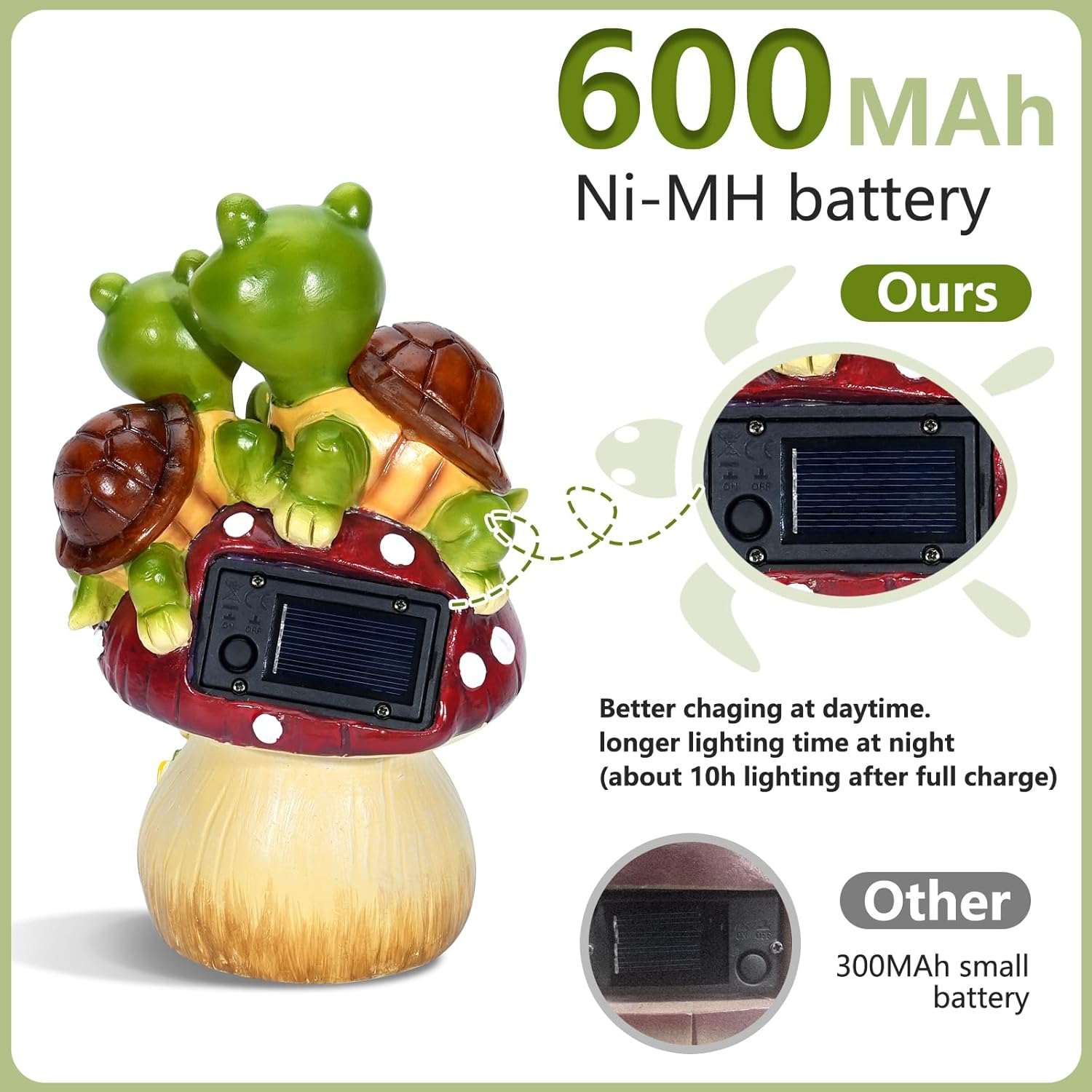- Solar Light Garden Statue: Our cute turtle mushroom statue will decorate your yard not only during the daytime, but also at night. 1.2V AAA 600mAH Ni-MH Battery - runs about 10 hours on a full charge of sunlight