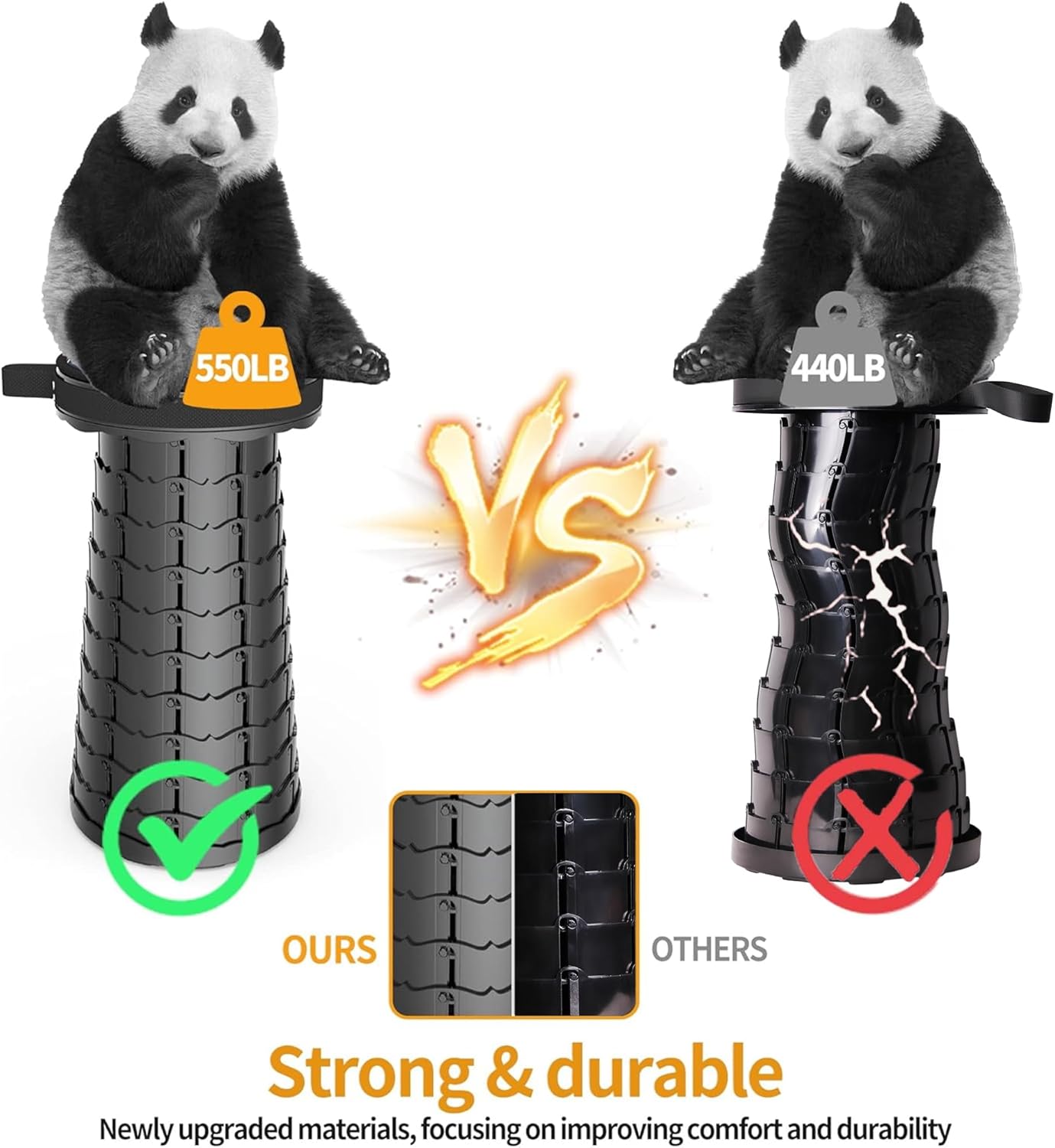 - 【ULTRA STABLE PERFORMANCE】 Upgraded telescoping structure and reinforced clasps give the foldable stool extraordinary stability and rigidity. Our Portable Travel Seat can support up to 550 lbs, far stronger than other similar products. Side support and the capacity of resistance to tilt are also reinforced, which makes the stool more sturdy and durable, ensure safety.