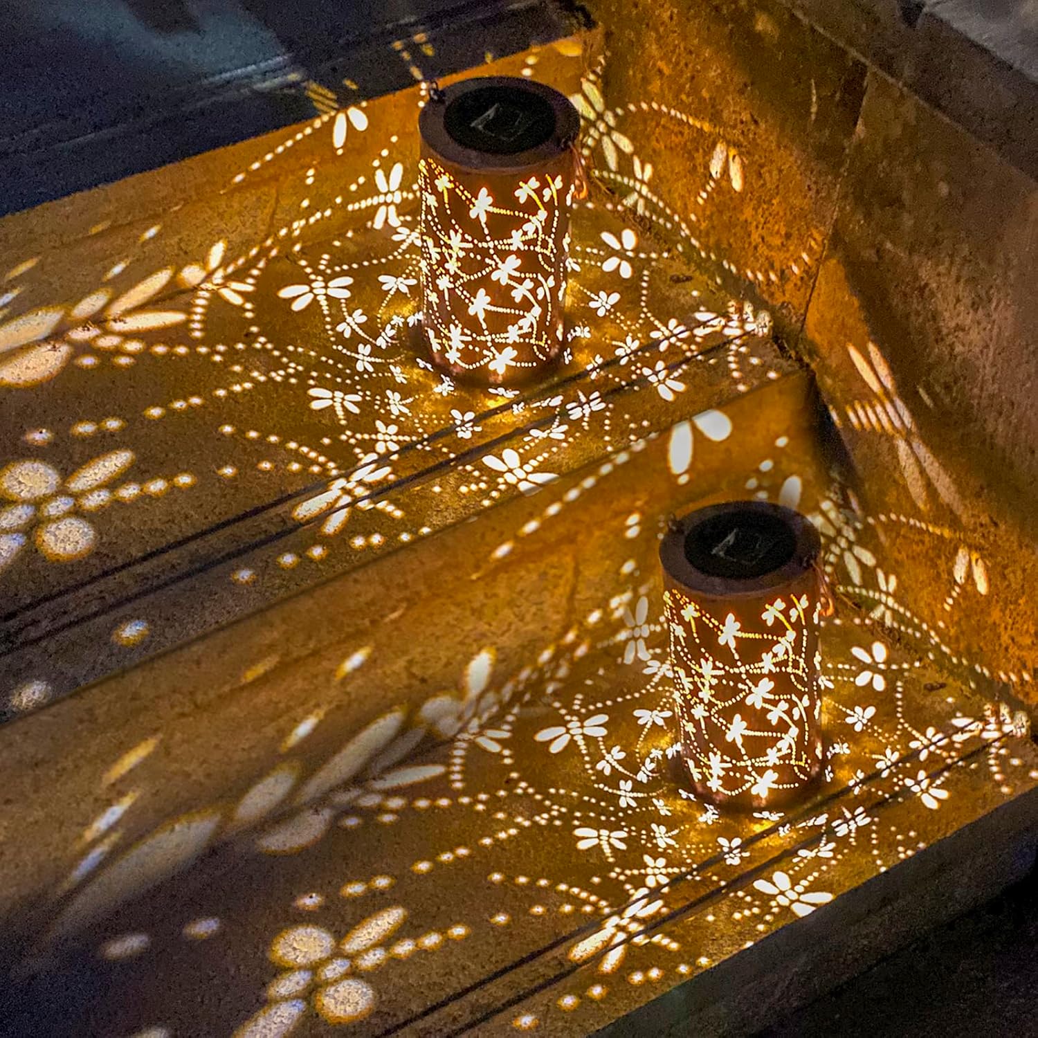 - Gorgeous & imaginative Garden Decor - Fusion the retro gold, copper of exteriors and irregular pattern inside, at darkness, the solar lantern casting a bright, warm light with dragonfly pattern, which looks like a dragonfly flying symbolizes change.