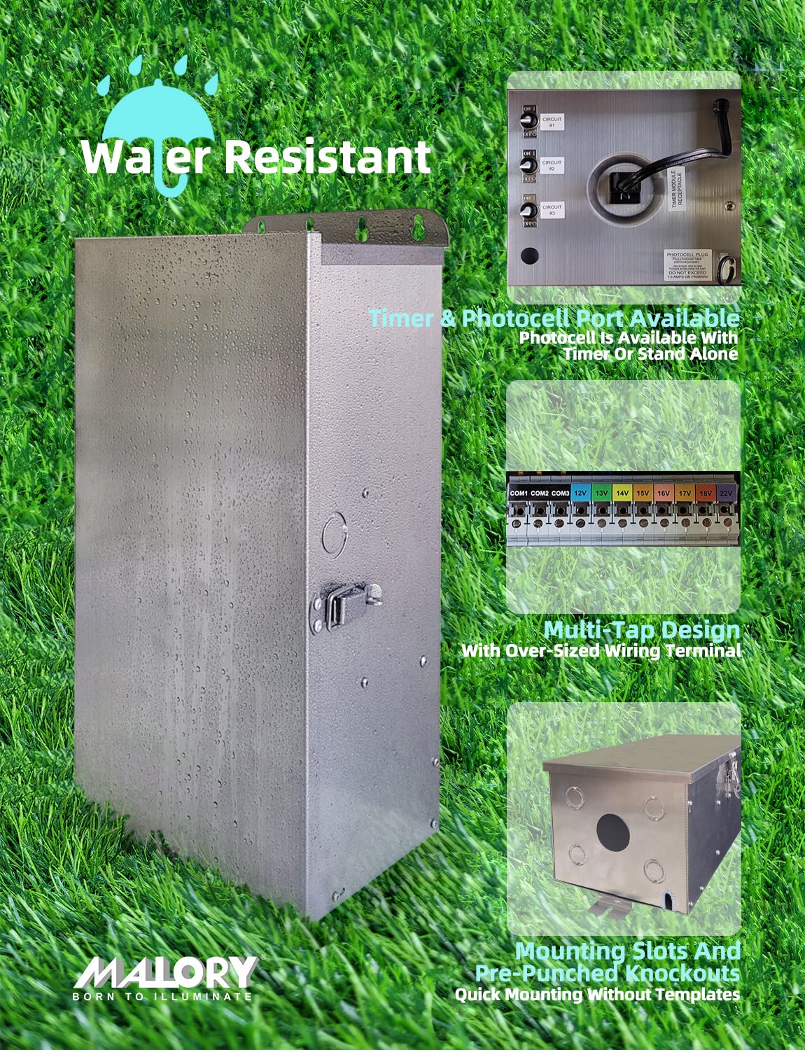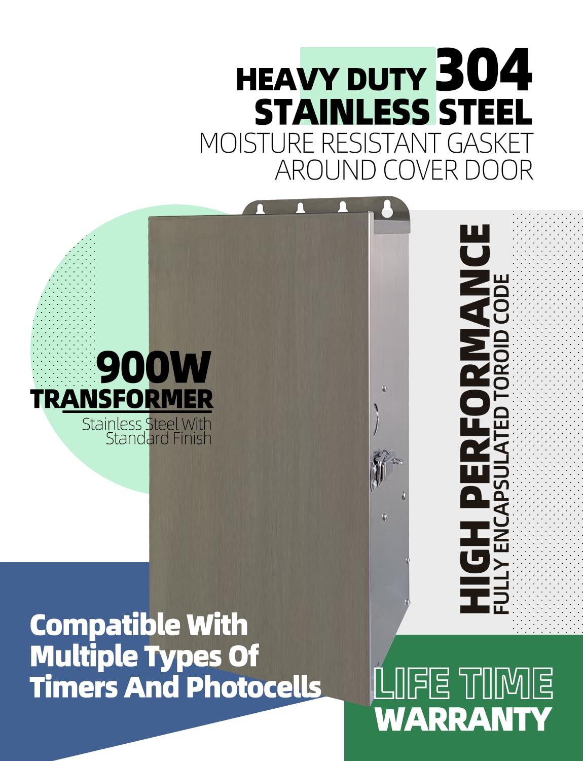 - Durable & Waterproof:Top grade 304 stainless steel outer shell does not corrode, protects the transformer against all severe weather conditions.The transformer has a locking latch, which can be locked to prevent children from opening it and prevent rainwater from entering.Mounting slots on top and bottom for quick mounting without templates. Removable bottom plate with pre-punched knockouts, allowing great access during installation.