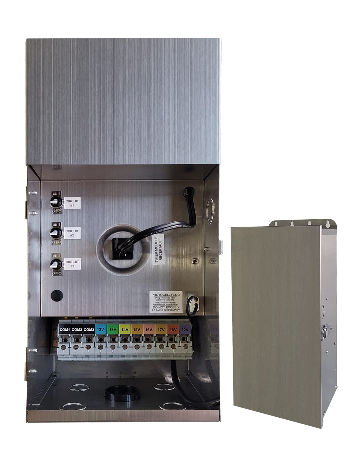 - Durable & Waterproof:Top grade 304 stainless steel outer shell does not corrode, protects the transformer against all severe weather conditions.The transformer has a locking latch, which can be locked to prevent children from opening it and prevent rainwater from entering.Mounting slots on top and bottom for quick mounting without templates. Removable bottom plate with pre-punched knockouts, allowing great access during installation.