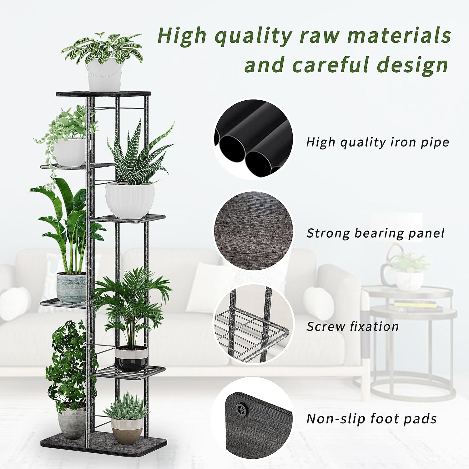 - 2.[Sturdy and Durable】This plant stand adopts a unique 4-tier layered design for even load bearing and not easy to deform, the thickened metal tube can withstand up to 150lbs, and its own feet can protect the floor well.