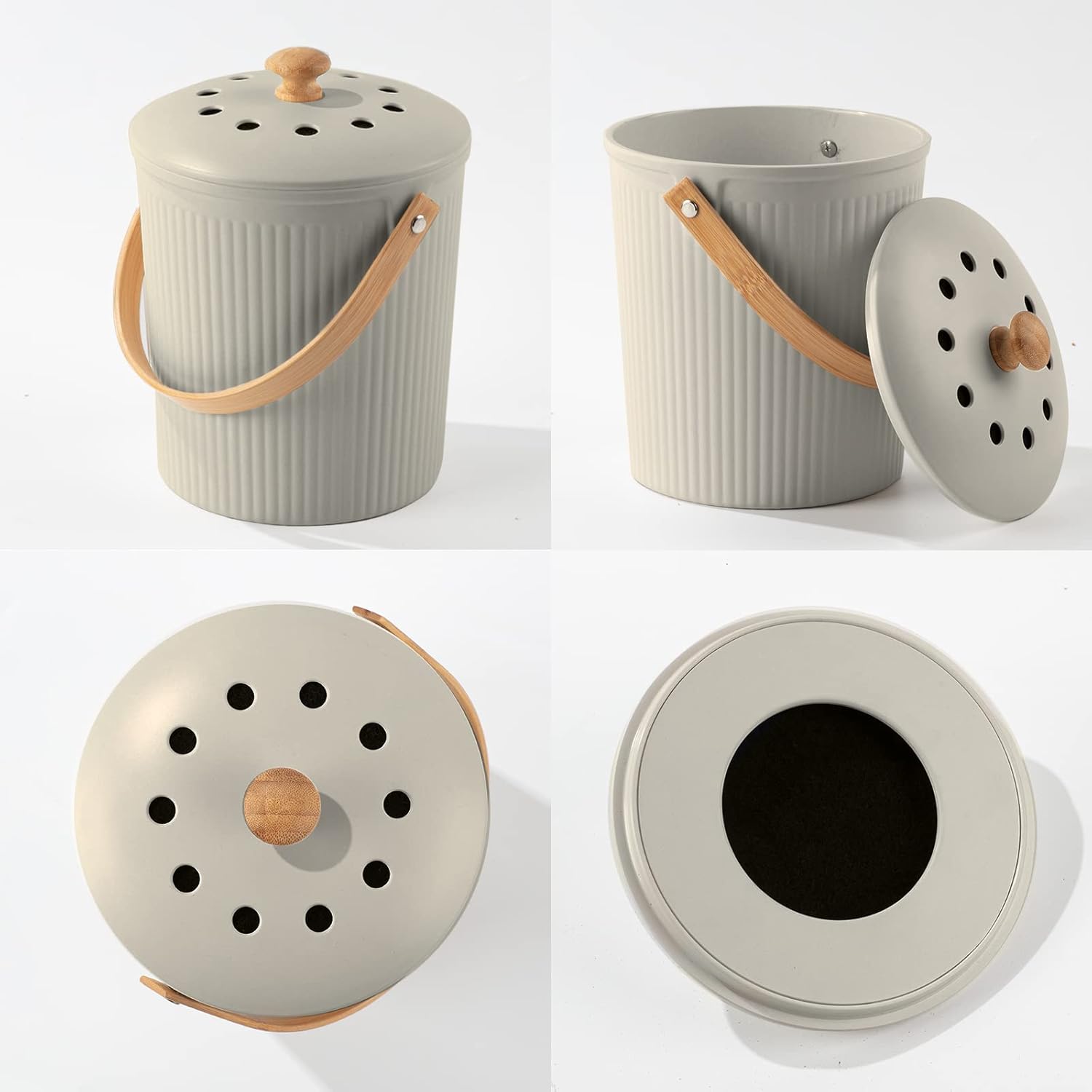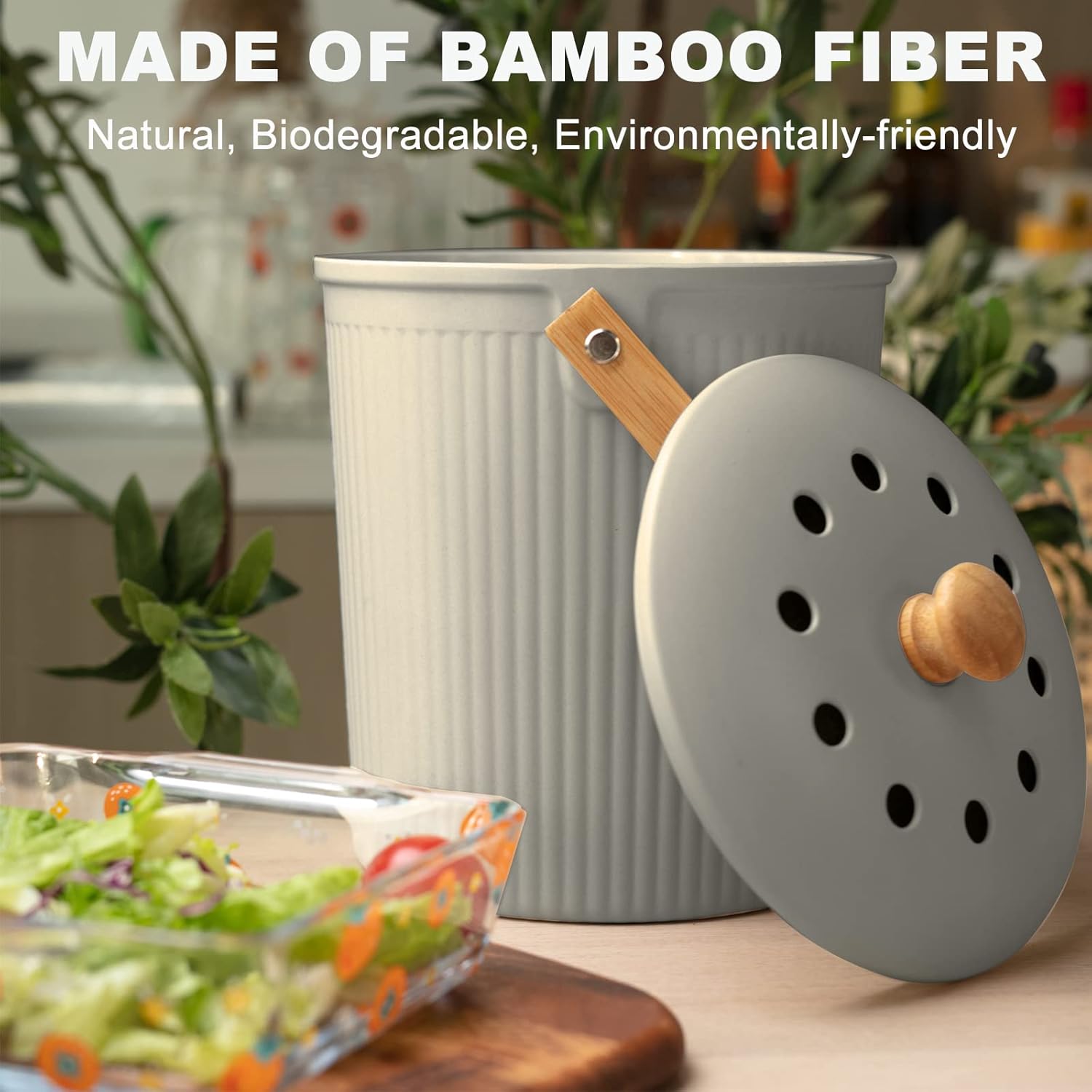 - All Natural: Made from earth-friendly recycled materials including Bamboo Fiber, Corn Starch, the compost bin kitchen counter with lid in itself is biodegradable.