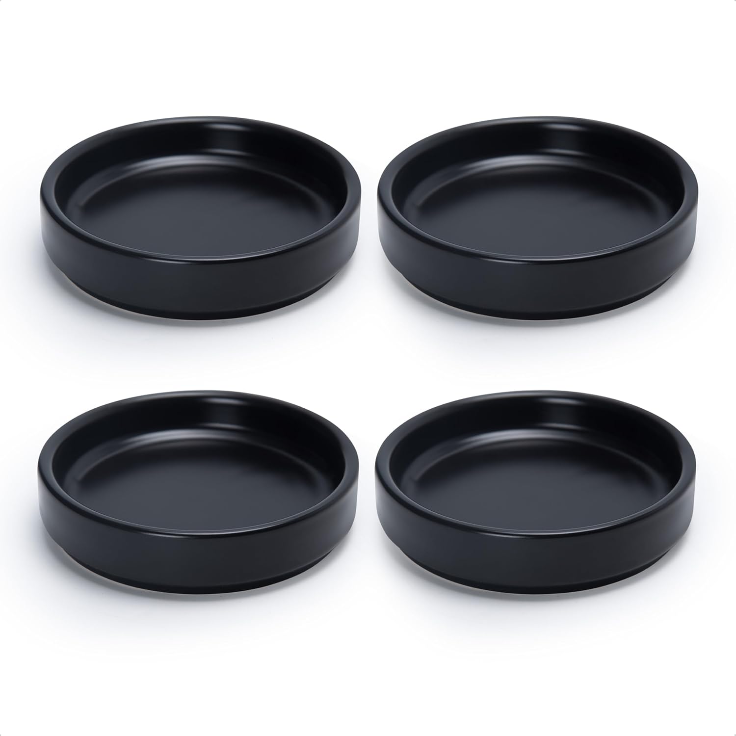 D'vine Dev Modern Round 3.7 Inch Ceramic Plant Pot Saucer, Planter Pot Drainage Tray for Indoor Plants, Set of 4, Matte Black, 97-T-B-11