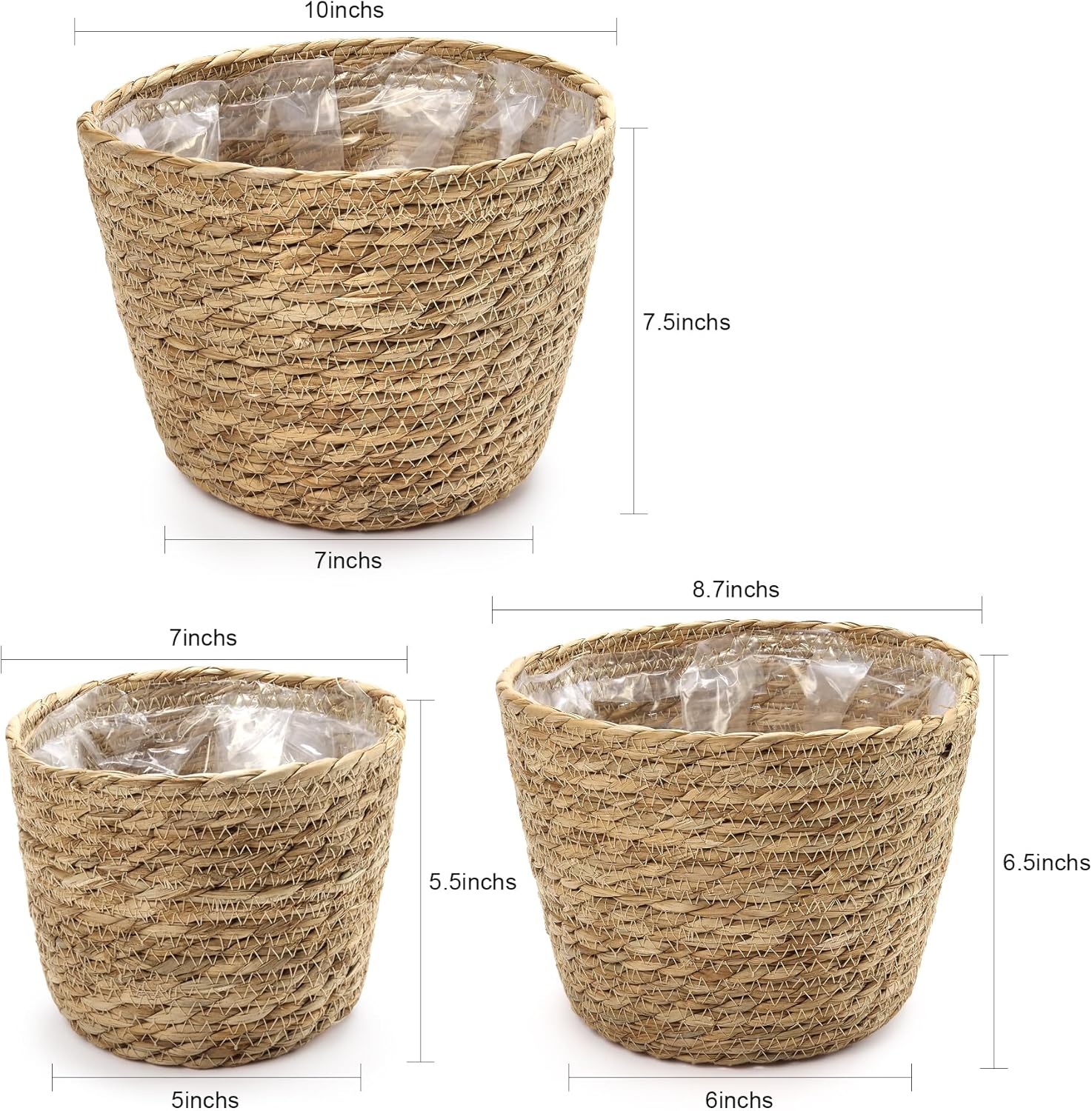 Athaliah Plant Basket, 3 PCS Plant Baskets Indoor with Plastic Liner, Water Hyacinth Woven Planters Flower Basket, Planter Basket for Rustic Boho Home Farmhouse Floor Potted Pots Decor