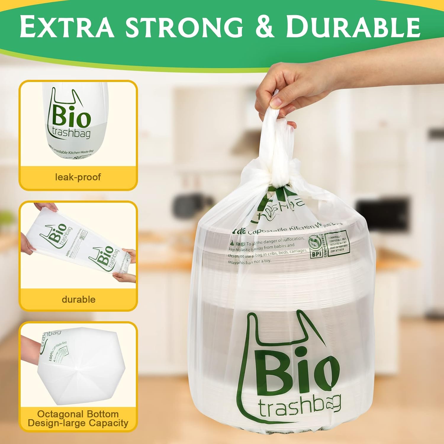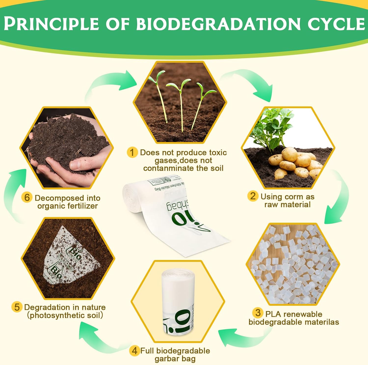 - Biodegradable Garbage Bags: BPI certified compostable bags,kitchen compostable garbage bags meeting US ASTM D6400 & EU EN 13432 standard. Made of cornstarch and renewable plant starch materials, it will decompose in the soil after 6-12 months