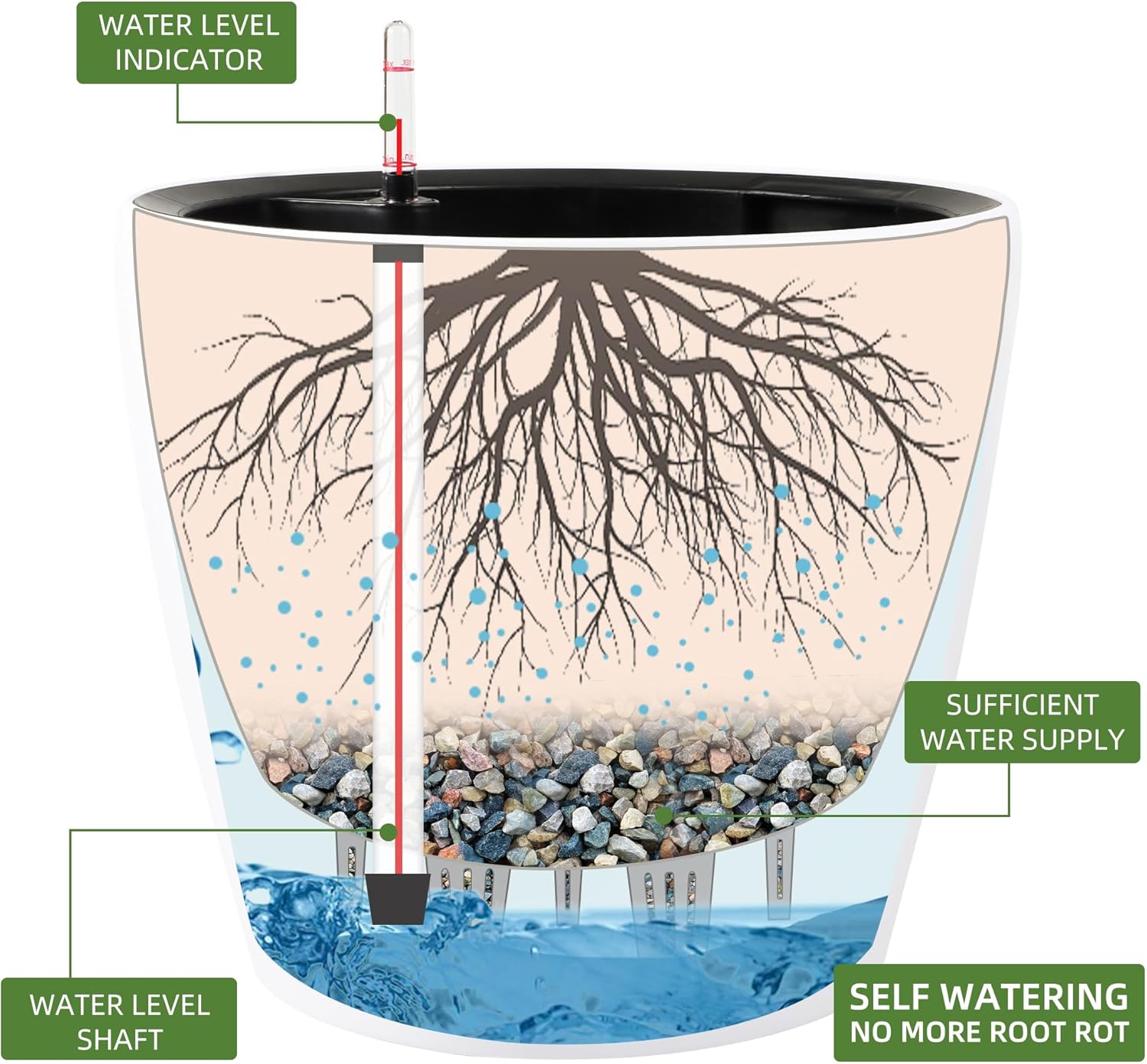 - SELF WATERING & NO MORE ROOT ROT - The smart unique sub-irrigation system is one of the most appealing aspects among all Dexceder planters. The easy-to-use separated integrated water reservoir or catcher- keeps your soil well aerated and automatic supplies plants with the right amount of ongoing moist air & nutrition for optimal growth. The insert indicator shows you the exact time to water again. The full water supply period can single-handedly last over 3 weeks based on different live plants