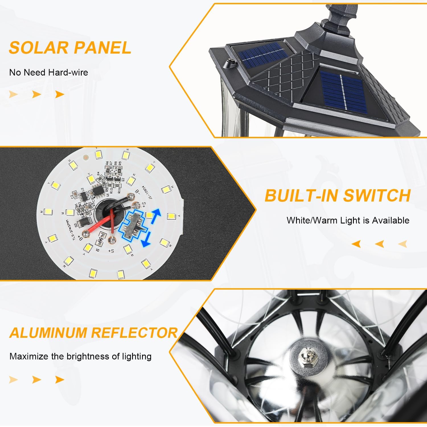 - 【LATEST SOLAR LIGHT TECHNOLOGY & AUTO ON/OFF】✨This outdoor solar lamp post lights use the most advanced solar panel and LED lighting technology, which not only increases brightness, but also protects the lamp's circuit and prolongs use time.The solar powered lanterns will be automatically working at dusk and off at dawn as there is light sensor included.