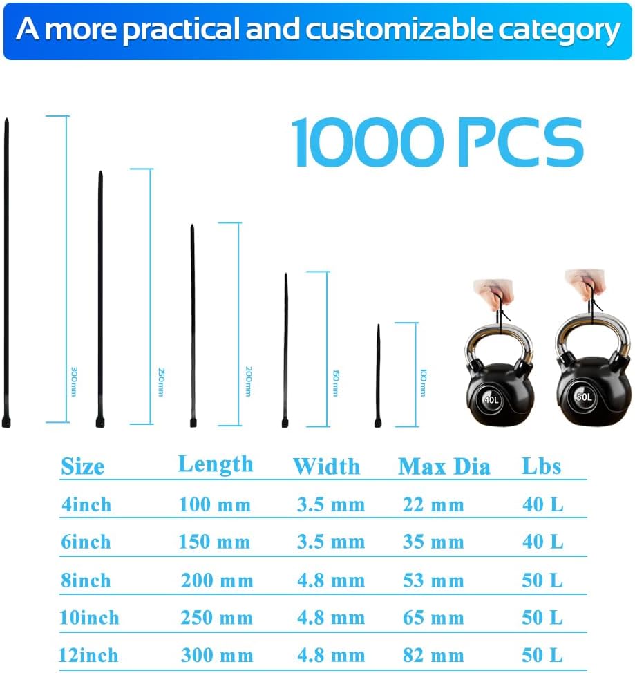 - High Tensile Strength: The 1000Pcs 6Inch Black Cable Tie Zip Ties are industrial level heavy-duty ties with a tensile strength of 40 pounds, making them strong enough to secure and organize a variety of items.