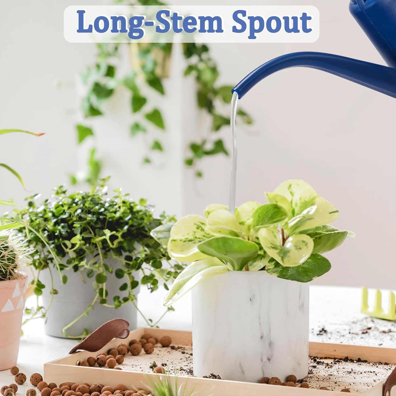 - Long Spout Watering Can: Long stem spout design, the narrow spout of watering can works well in directing the water to the precis positions of your plants, like poking between foliage and sending water to root of the each plant accurately.