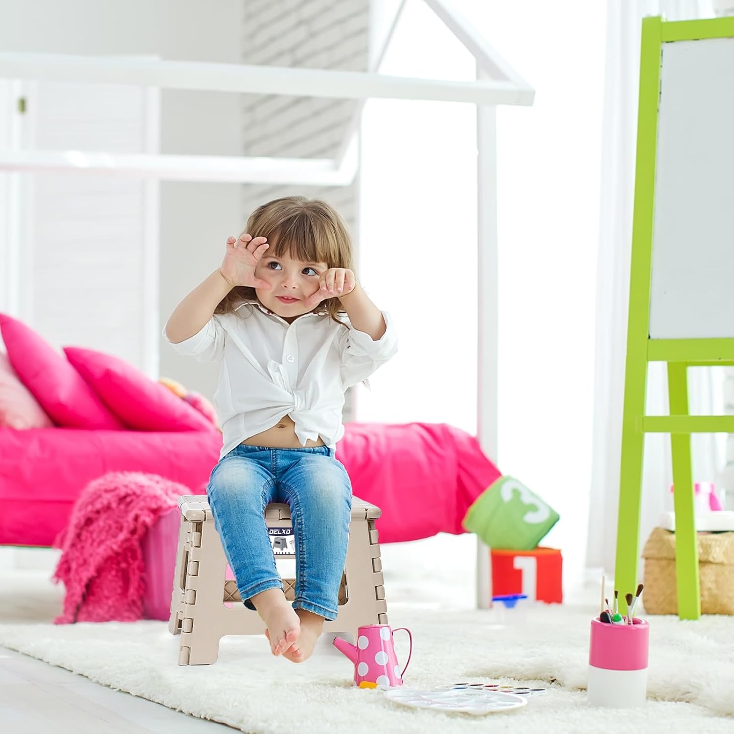 - Safe Upgrade Step Stool : Features improved the folding bar,which can prevent from collapse inward while Steping on it.Delxo have designed a safety stop gap feature that allows the foldable stool to prevent being squashed. Four round corner super safe protect your body from clashing. All of this design is put your safe first