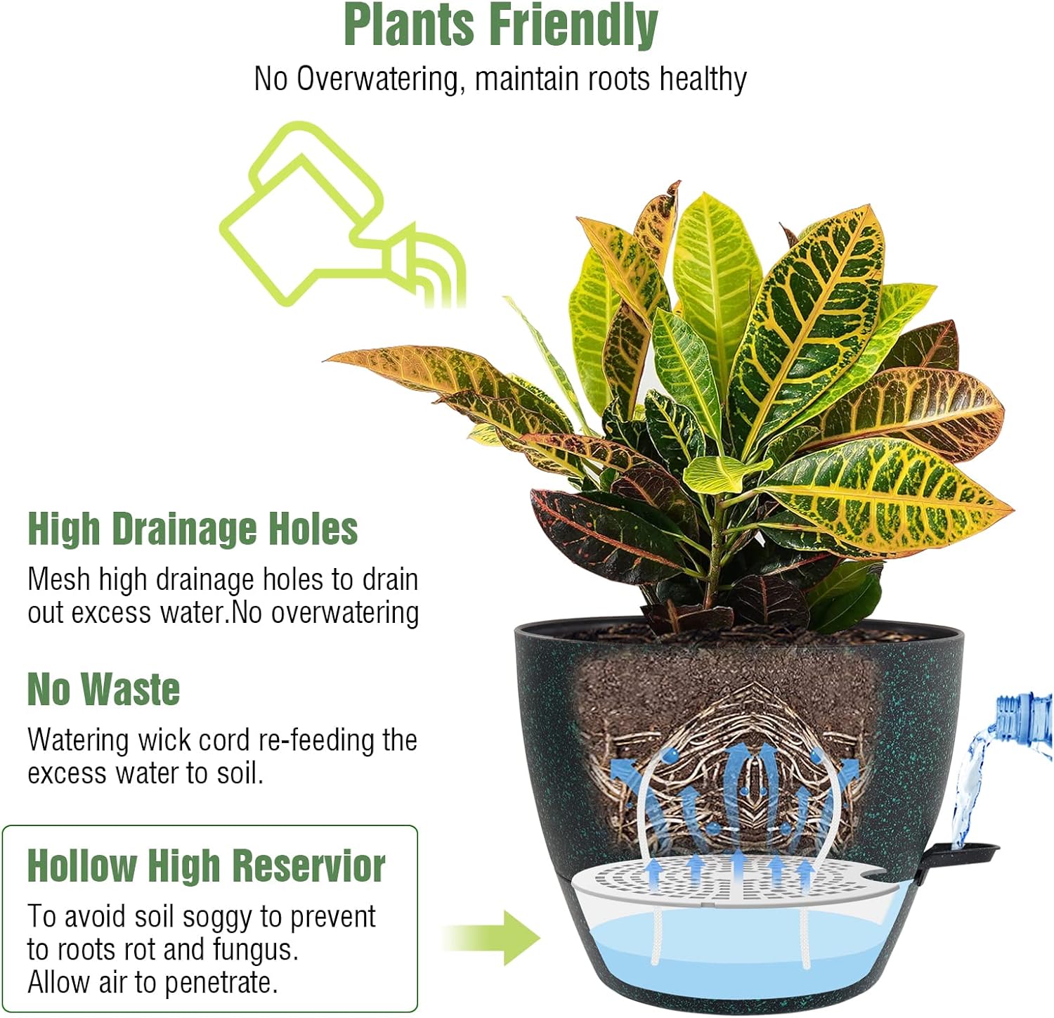 Large Self Watering Pots, 12/10/9 Plastic Planters with High Drainage Holes and Deep Reservoir for Indoor Outdoor Garden Plants and Flowers, Black with Green Speckles
