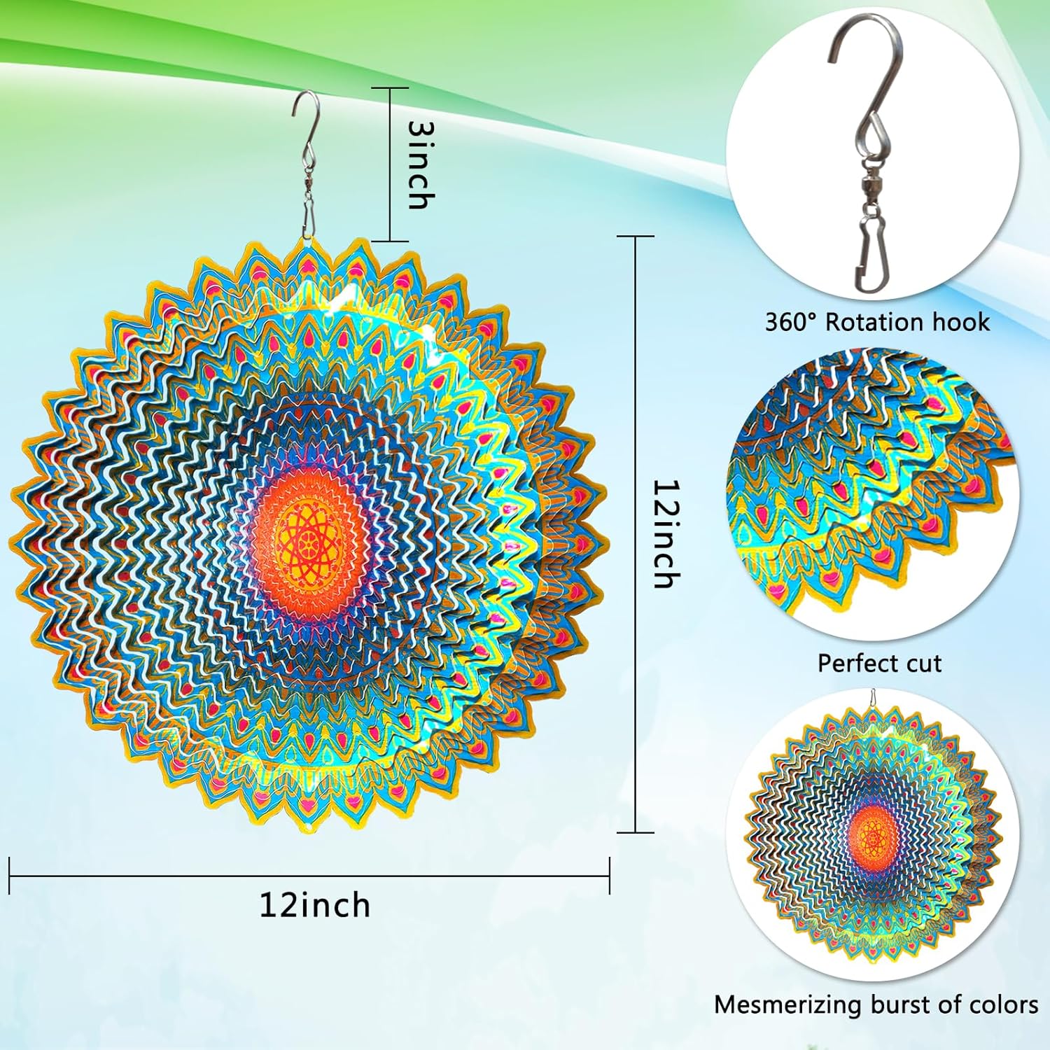 Goolyrusim Wind Spinner Mandala Circle - 3D Wind Spinners Outdoor, 12-inch Stainless Steel Hanging Wind Sculptures for Yard and Garden, Kinetic Art Decoration Porch Decor Patio Ornament, Mandala Gift