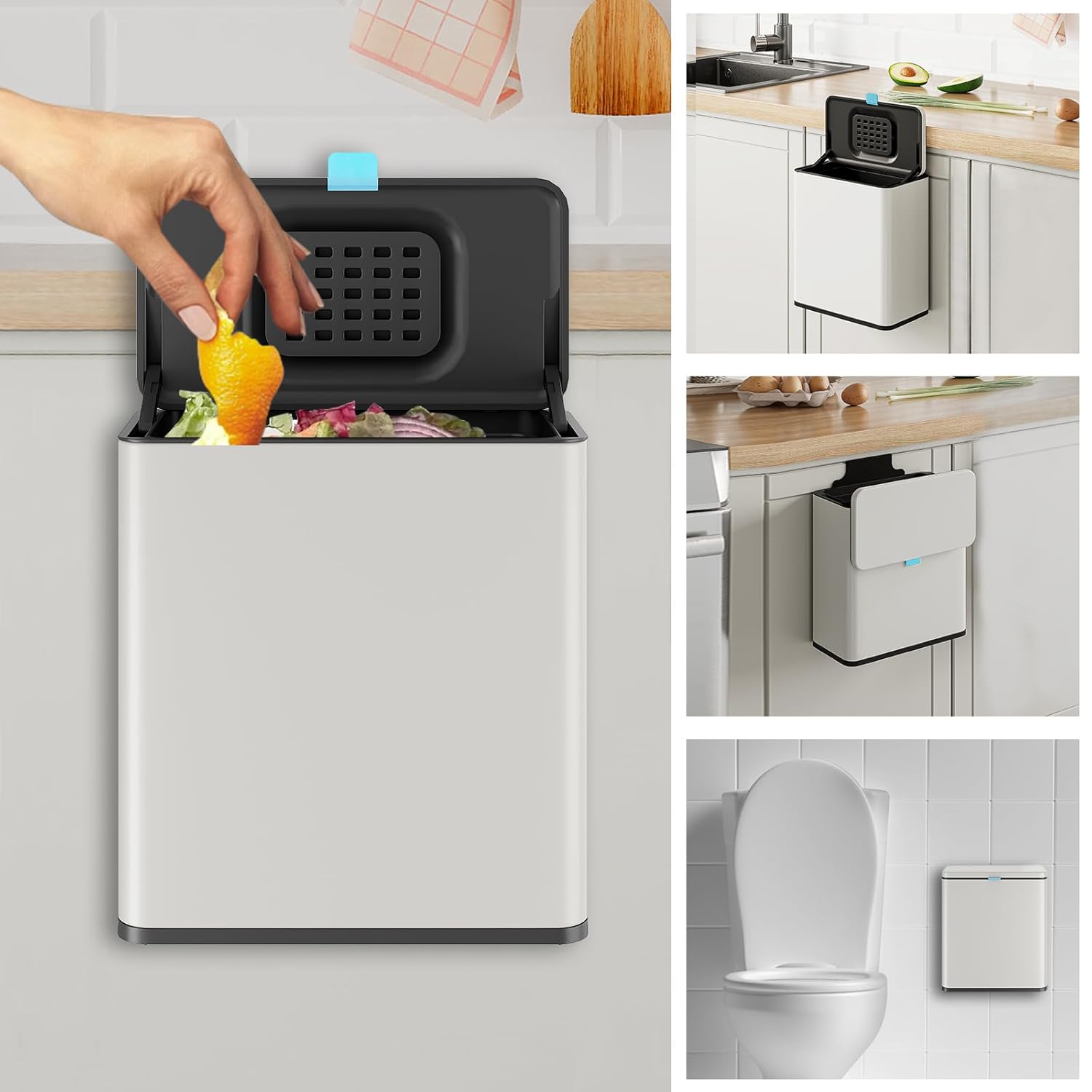 Stainless Steel Hanging Trash Can with Lid and Inner Bucket, 2 Gallon Kitchen Compost Bin for Counter Top, Under Sink or Wall Mount, Small Garbage Can for Cupboard/Bathroom/Bedroom/RV, White