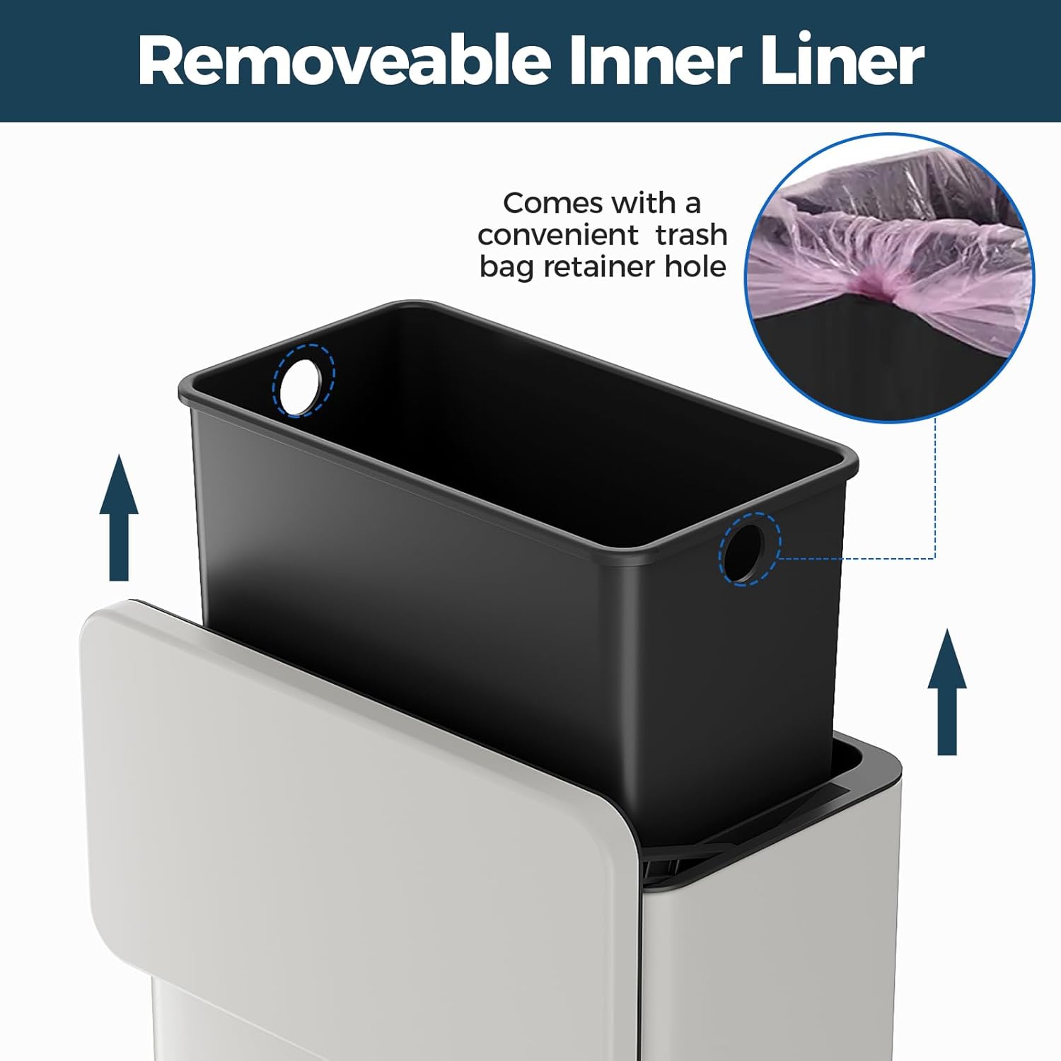 - Removeable Plastic Inner Liner - It is easy to remove for dumping the garbage or cleaning. Waste will not touch the stainless steel outer bin, preventing rusting and leaking. The retainer hole of the inner trash can helps keep the garbage bags from sliding down and looks more tidy.