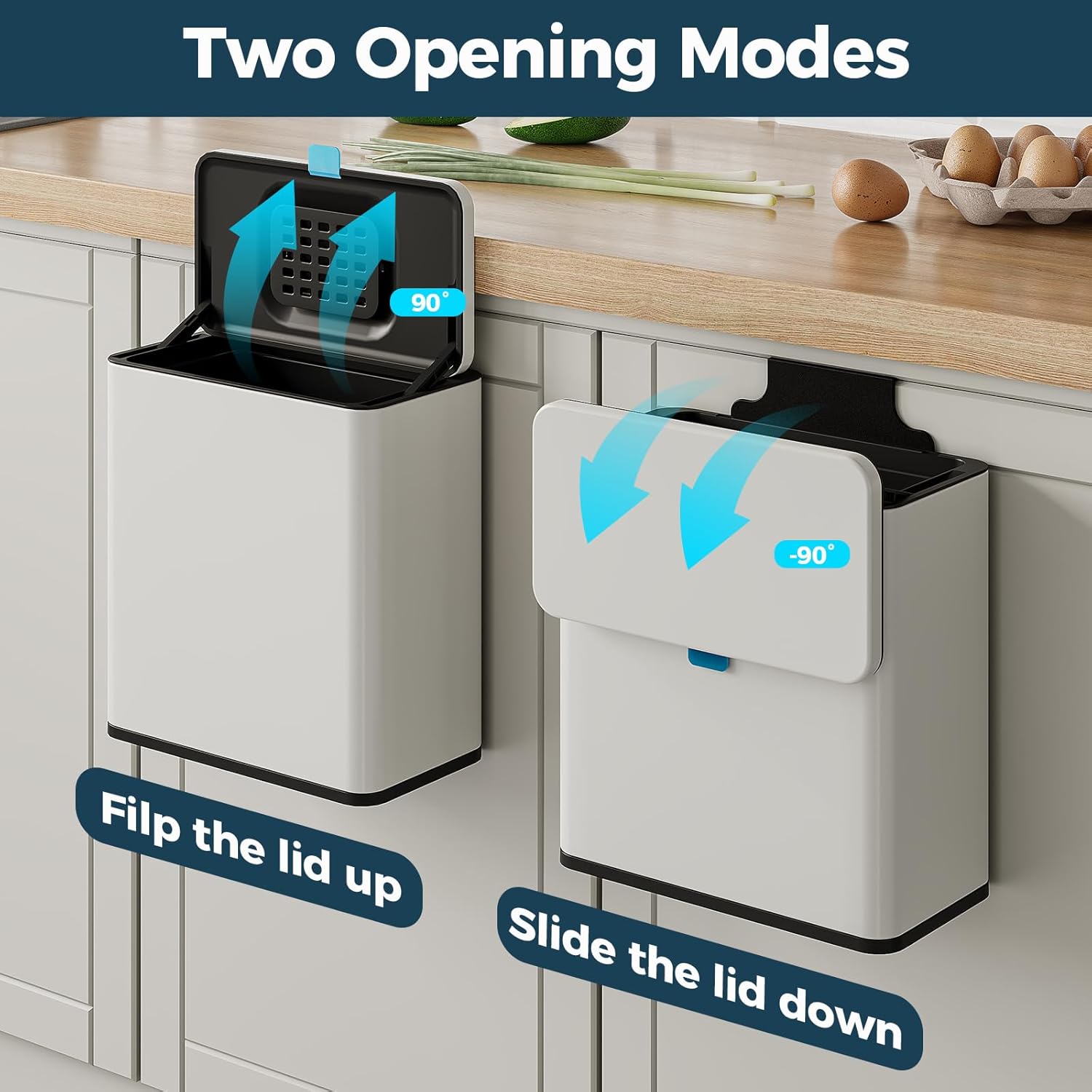 - Two Opening Modes - Flip up the lid or Slide the lid down, Come with a comfortable silicone carrying handle allows you to dispose of the waste quickly and cleanly with a simple pull or slide, depending on your habits and position.