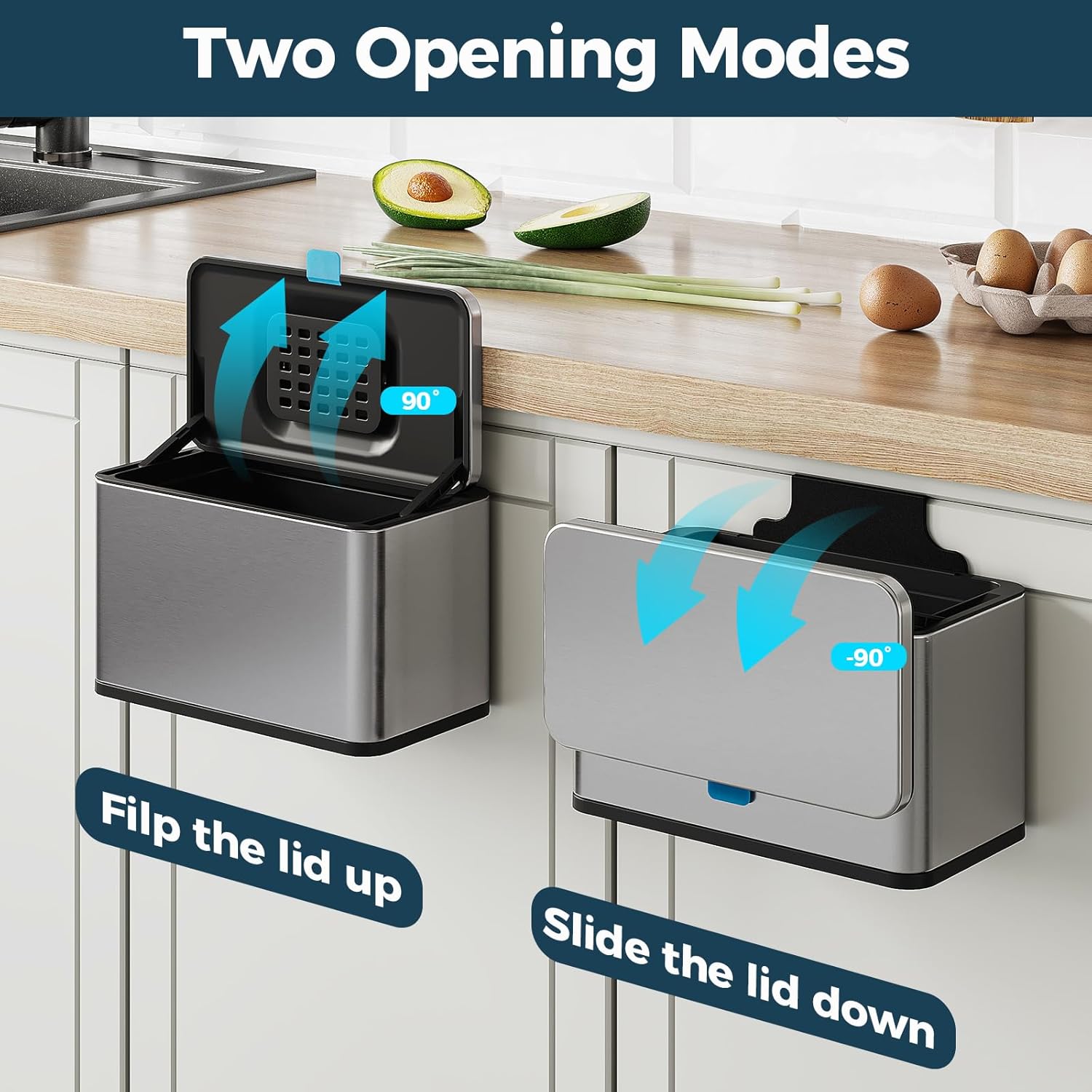 - Two Opening Modes - Flip up the lid or Slide the lid down, Come with a comfortable silicone carrying handle allows you to dispose of the waste quickly and cleanly with a simple pull or slide, depending on your habits and position.