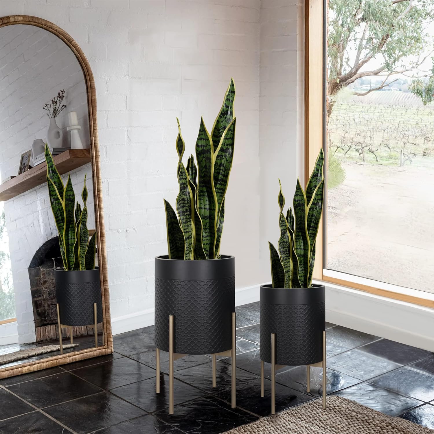 - Modern Planter: Gold metal stands with wave black pots reflect the minimalist style of mid-century. It is the perfect complement to modern decorating styles.
