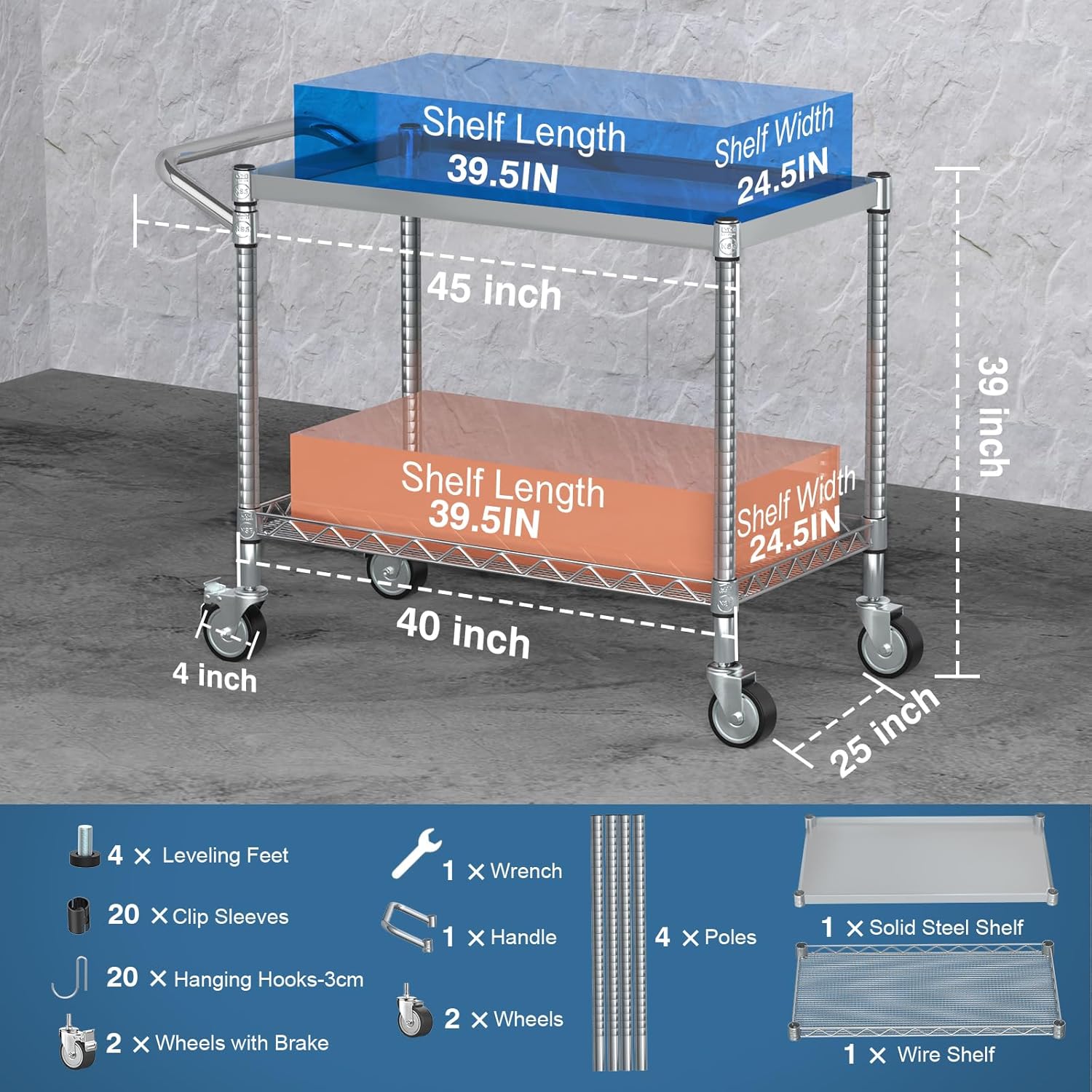 Leteuke 2 Tier Utility Tool Cart with Wheels, 900LBS Capacity Heavy Duty Rolling Utility Carts with Handle, Commercial Grade Metal Serving Storage Cart for Warehouse Garage Kitchen,Silver