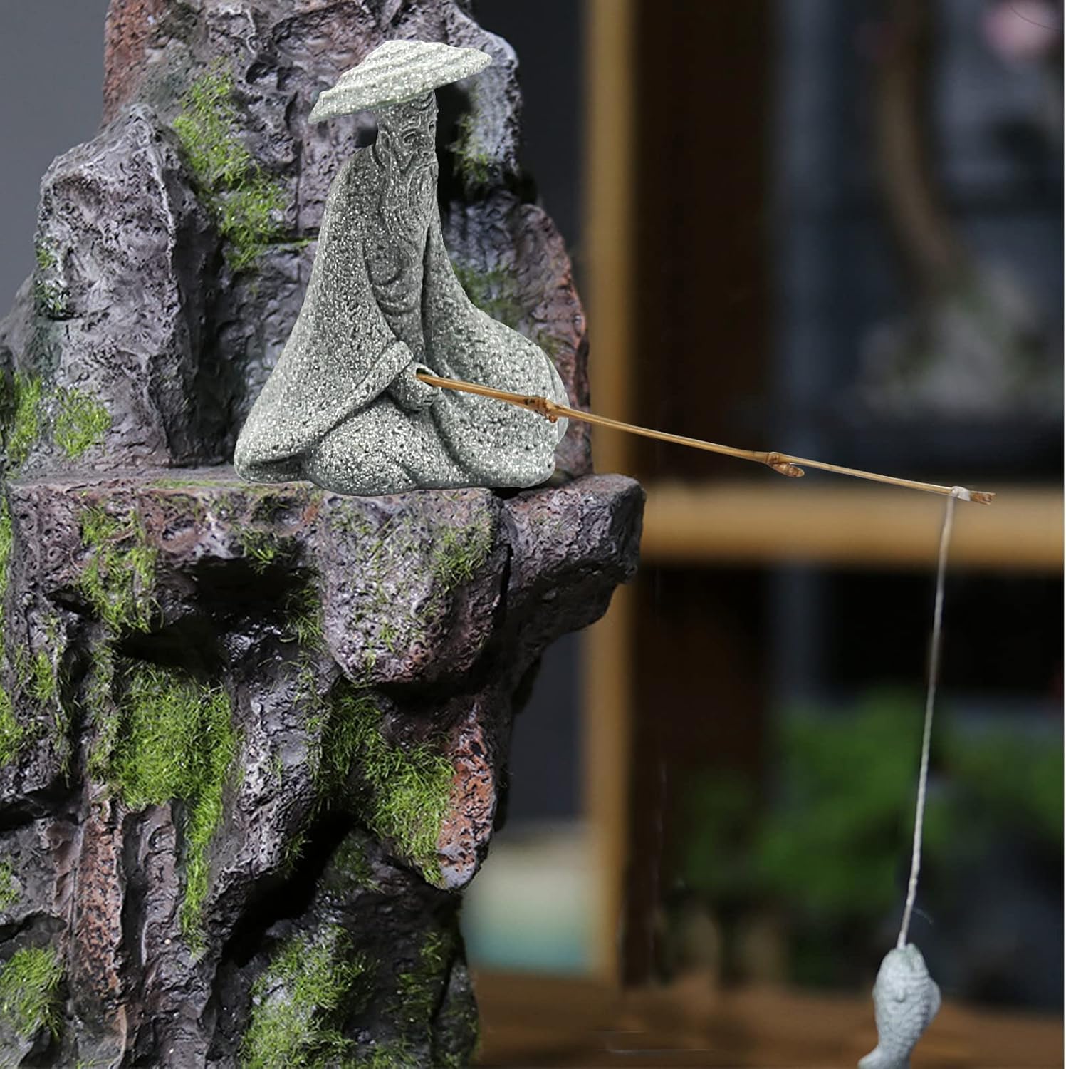 2PCS Sitting Fishing Figurines Sandstone Vintage Ornament Japanese Decor for Fish Tank Pot Garden Home Aquarium Mini Fisherman Statue Asian Zen Decoration