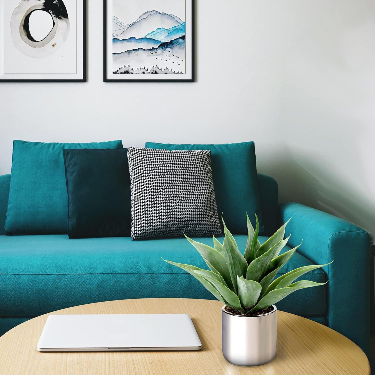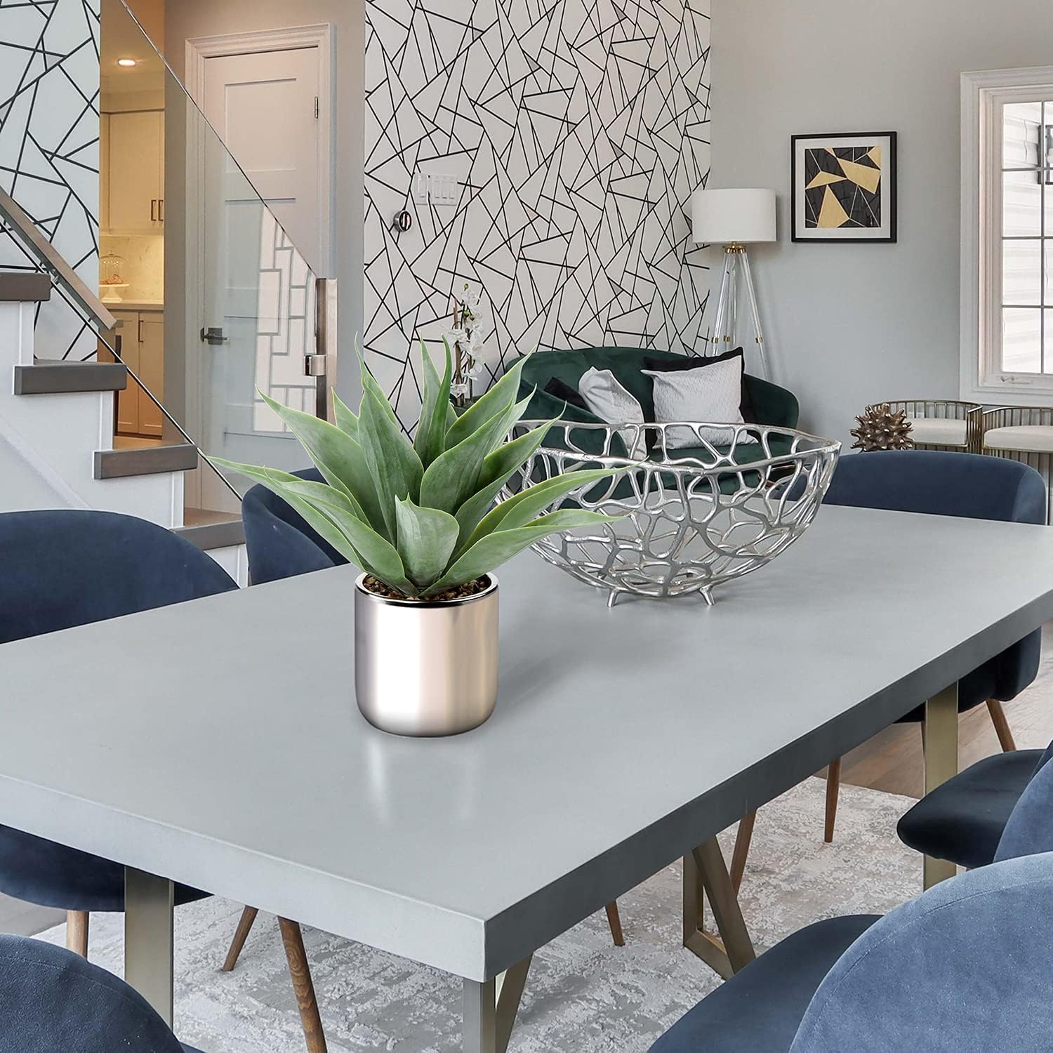 - [High-quality Artificial Agave Plant] -13 faux aloe vera leaves are elegantly arranged in a sturdy, shiny silver-plated pot and surrounded by natural stone pebbles. The overall height of faux potted plant is about 13". Luxurious pot: 4.3" W x 4 .7" H.