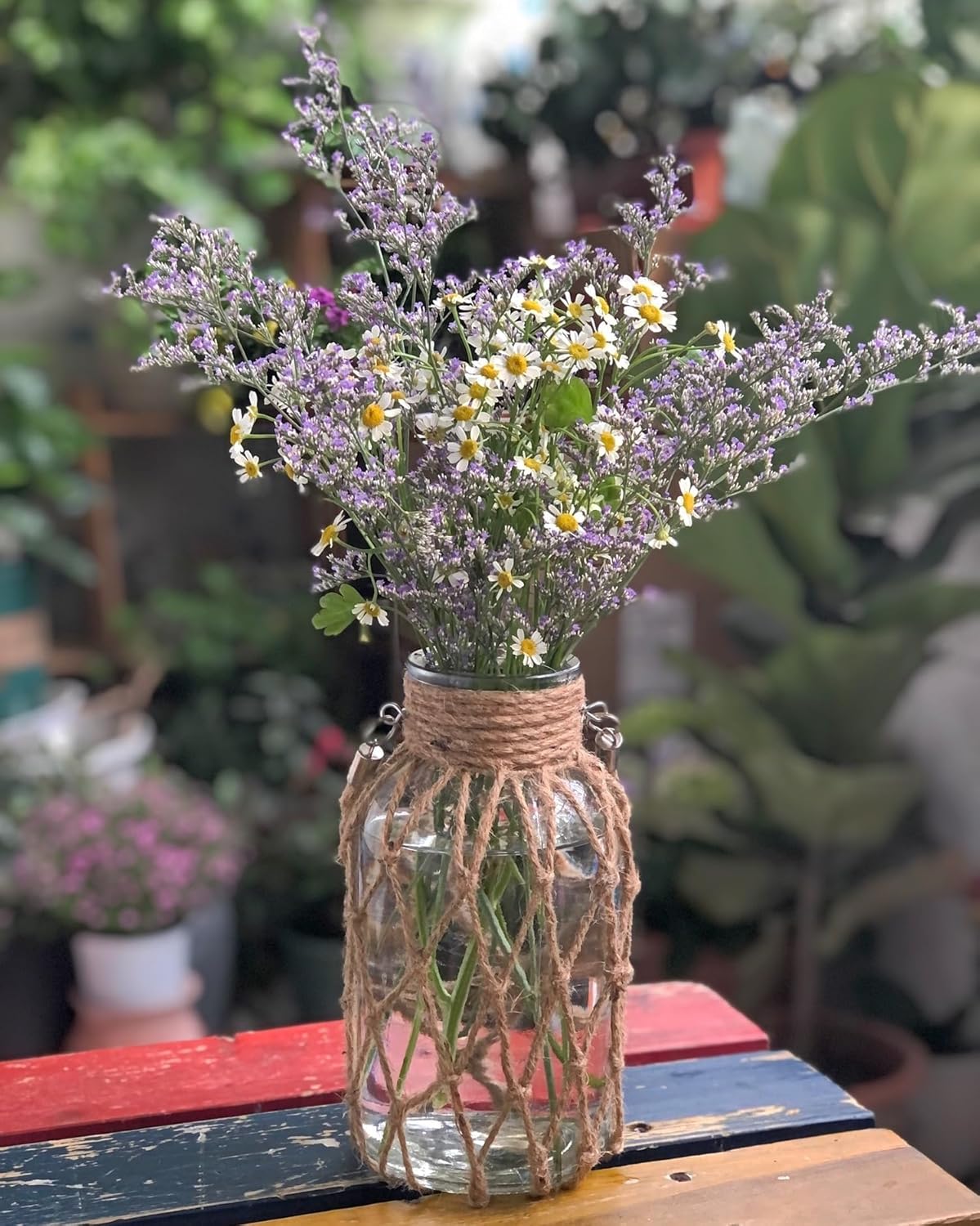 - this rustic vase creatively use rope net design The aesthetic combination of clear glass and jute is simple and elegant, enhancing the decorative style and rustic ambience of your interior home space