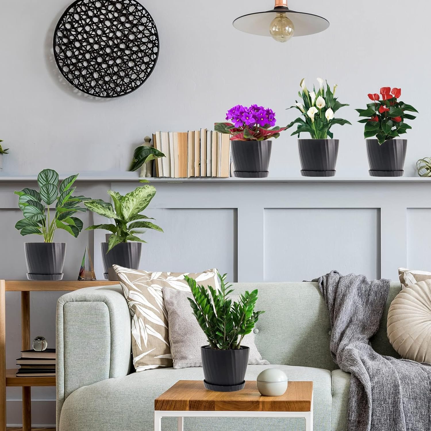 - DECORATION YOUR HOME GARDEN - 6 pack 7 inch planters with grey color, transplant plants to these pots, fill up with mix soil, water and let drain, then place a saucer under each plant. Brings a new stylish home garden. Pefect for hanging up or placed on windowsill, shelf, bedroom, kitchen, office, desktop, garden, etc.