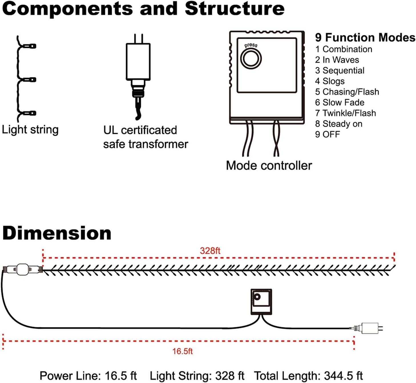 - 8 Lighting Modes: This holiday decorative string light has 8 lighting modes for you to choose: combination, in waves, sequential, slogs, chasing/flash, slow fade, twinkle/flash, and steady on. Fit different occasions and environment, adjust the lighting modes by using remote control or pressing the round button on the black mode controller box