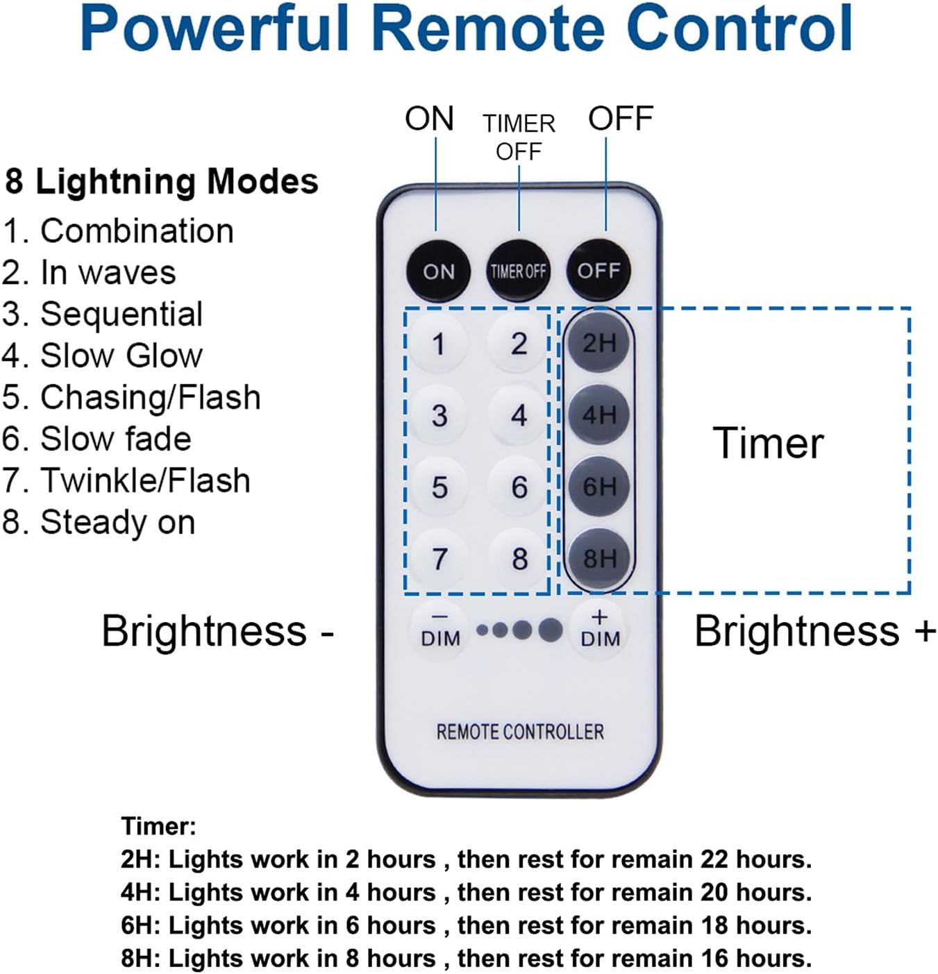 - 8 Lighting Modes: This holiday decorative string light has 8 lighting modes for you to choose: combination, in waves, sequential, slogs, chasing/flash, slow fade, twinkle/flash, and steady on. Fit different occasions and environment, adjust the lighting modes by using remote control or pressing the round button on the black mode controller box
