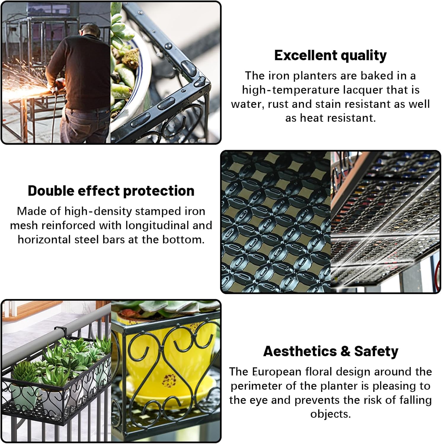 - High quality: Balcony railing planter is made of premium iron,rustproof wrought iron craft,durable and reliable,with good load-bearing capacity and certain anti-rust ability,it is an excellent choice for growing flowers on your balcony fence. simple but elegant look,ideal for hanging railing planter stand