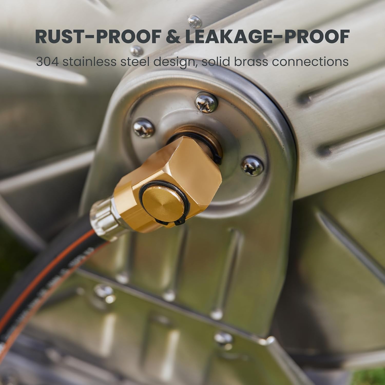 - Heavy Duty Construction: Industrial grade stainless steel makes the hose reel cart solid and durable, corrosion and impact restitant, and the solid brass connector features leakage-proof and wear-resitant, together ensuring a long service life.