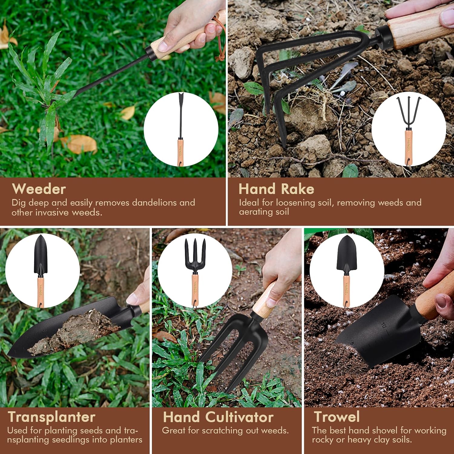 YAUNGEL Garden Tools - 10Pcs Garden Tool Set Heavy Duty Stainless Steel Gardening Supplies Hand Tools with Wooden Handle, Storage Tote Bag, Ideal Gardening Gifts for Women and Men, Black