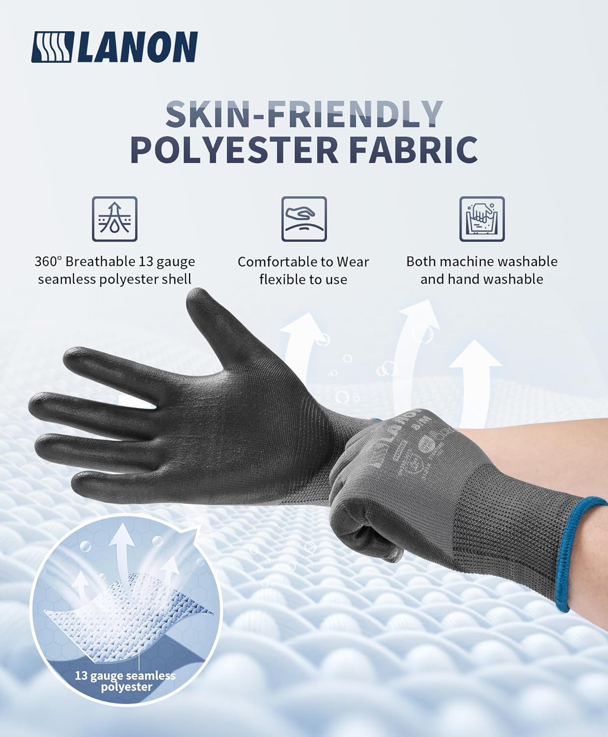 LANON 18 Pairs Safety Work Gloves, Mechanic Working Gloves for Men,Breathable PU Coated, Seamless Knit,Double Wash, Grey, Large