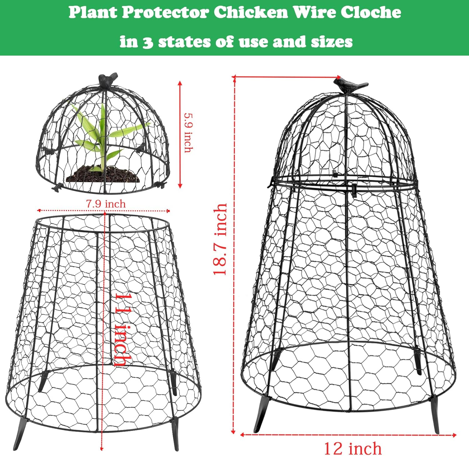 - 【Large Size 】Garden cloches for plants Size: 18.7 in (H) x 12 in (W) Plant protector of 2 parts they are secured by exclusive clips and can be used again and again, very sturdy: The topped by a 7.9in (w) x 5.9 in (H), Chicken wire cloche with a hummingbird handle on top, Bottom dimensions of plants protector: 11 in(H) x bottom 12 in (W) x top 7.9 in (W) conical wire cloche and the bottom has 4 pcs 2 inch ground spikes to insert into the soil to fix plant protectors from animals.