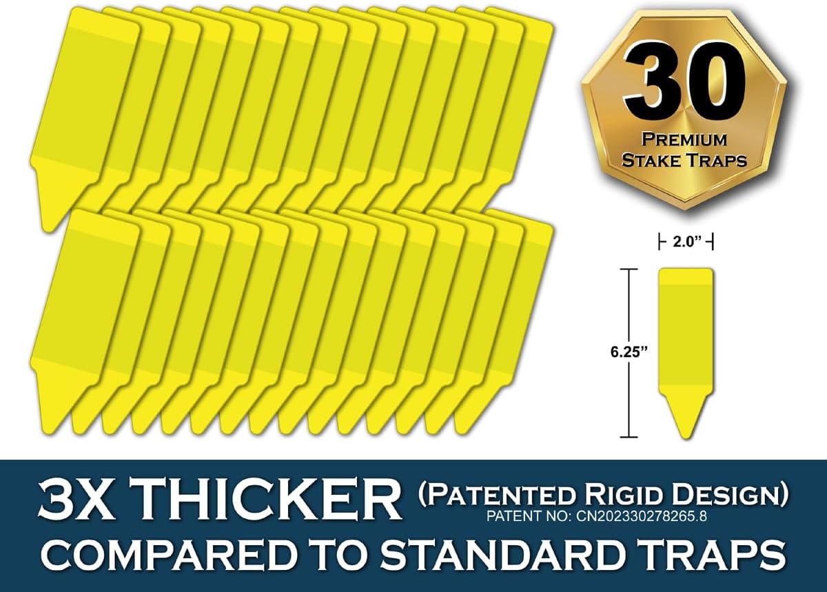 - β QUALITY DESIGN: While fun shapes may appear charming for gardening accessories, they can potentially disturb your plants or prove challenging to position. Our simple, garden-themed patented stake shape enables easy insertion into any potted plant or hassle-free hanging on trees. Furthermore, our dual-sided glue stake boasts three times the thickness of other standard traps.