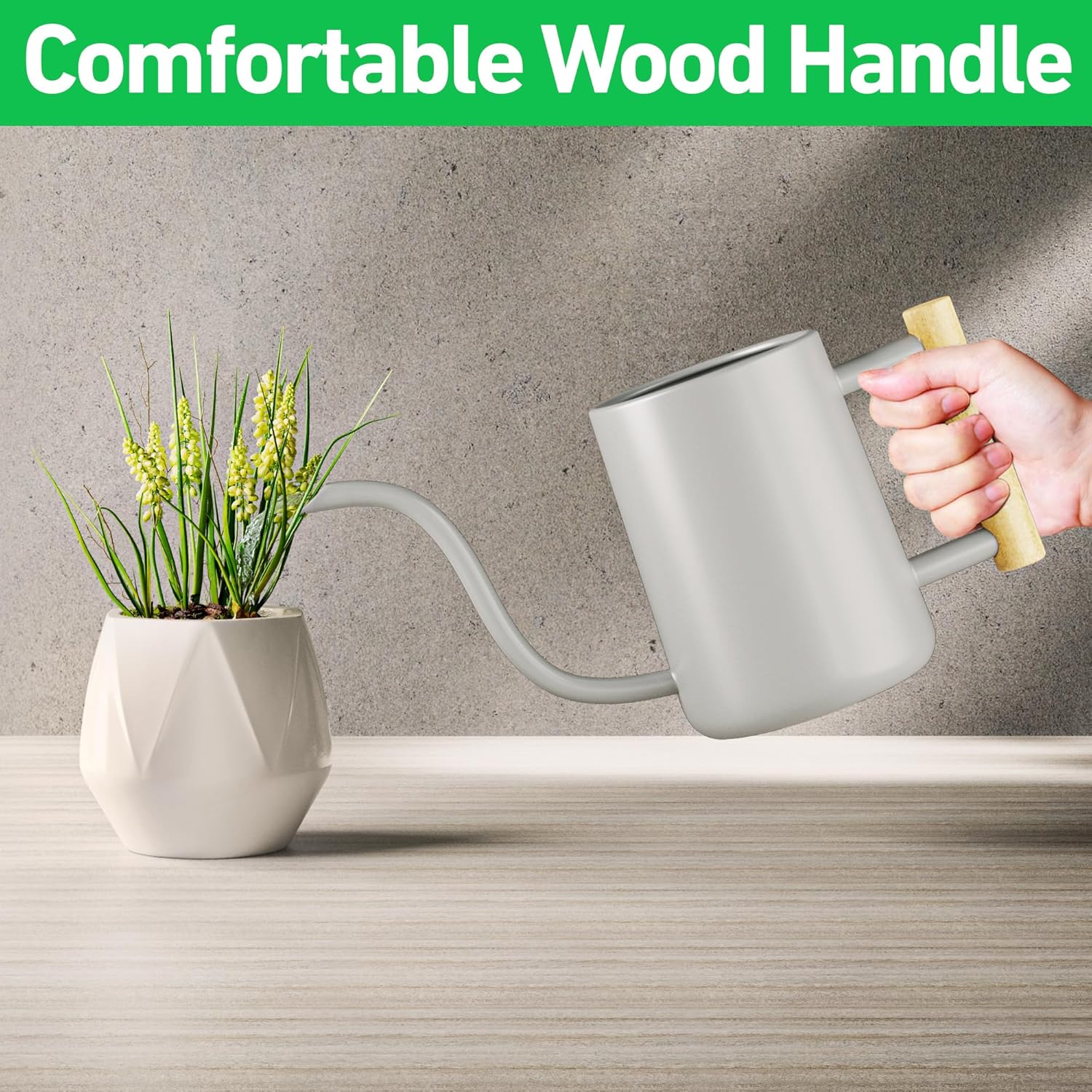 35 oz Metal Small Indoor Watering Can with Long Spout & Real Wood Handle for House Plants, Succulents, Cacti & Seedlings - Gray Long Spout Watering Can Indoor Plants - Stylish, Gentle Flow, No Spills