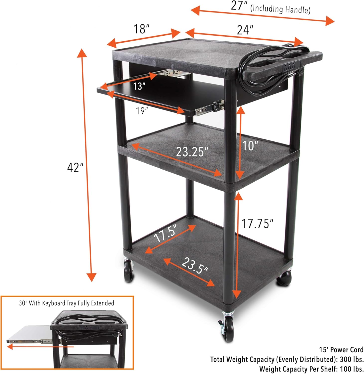 - BUILT-IN POWER STRIP: The Line Leader Rolling Cart has a 3-outlet power strip built right into the handle and a 15β power cord!