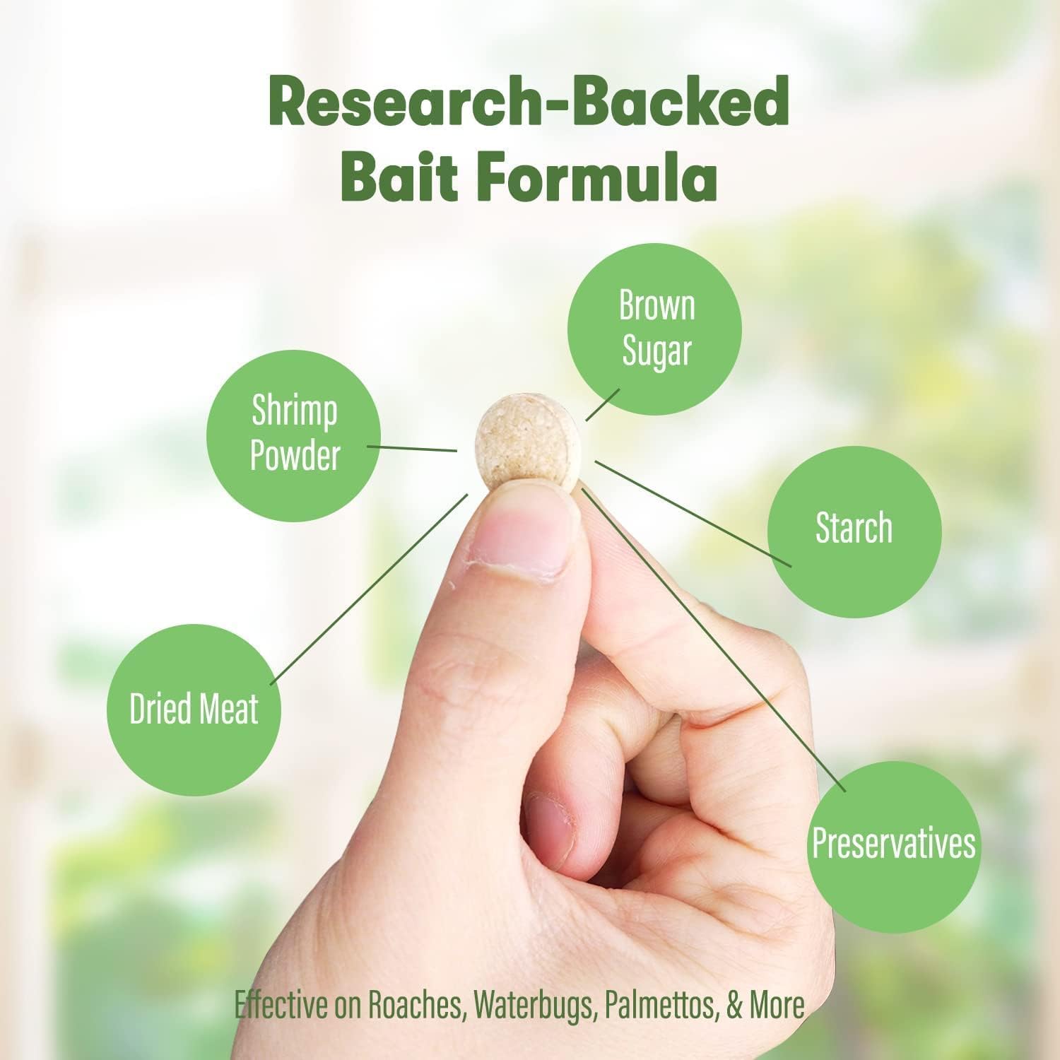- Insect Trap With Food Bait Tablets: Powerfully lure roaches, spiders, other bugs and pests with an irresistible bait tablet made from shrimp powder, dried meat, starch, and brown sugar