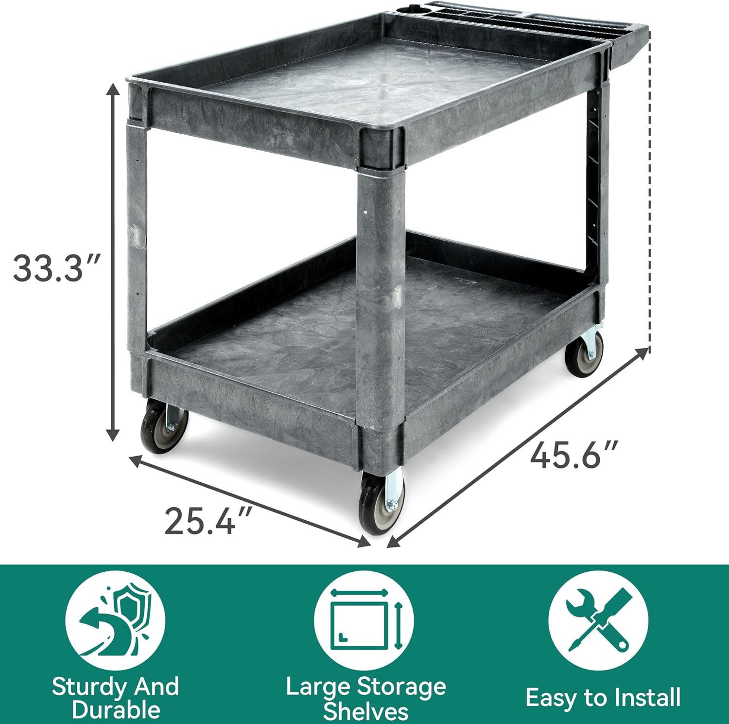 - 3-STEPS INSTALLATION: The package comes with professional installation instructions, you don't have to worry about the installation at all.Utility carts with wheels size description: 45x25x33.3 inches, Load Capacity: 550 lbs, Number of Layers: 2 layers. With this extra large heavy duty work cart, you can store more and push it easily.
