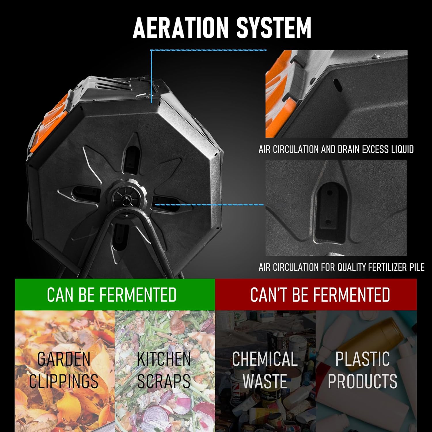 - Sturdy & Durable: Made with a high-grade metal frame and a robust plastic body, this tumbling composter boasts corrosion-resistance and weather-resistance. Its sturdy construction ensures durability for a prolonged service life.