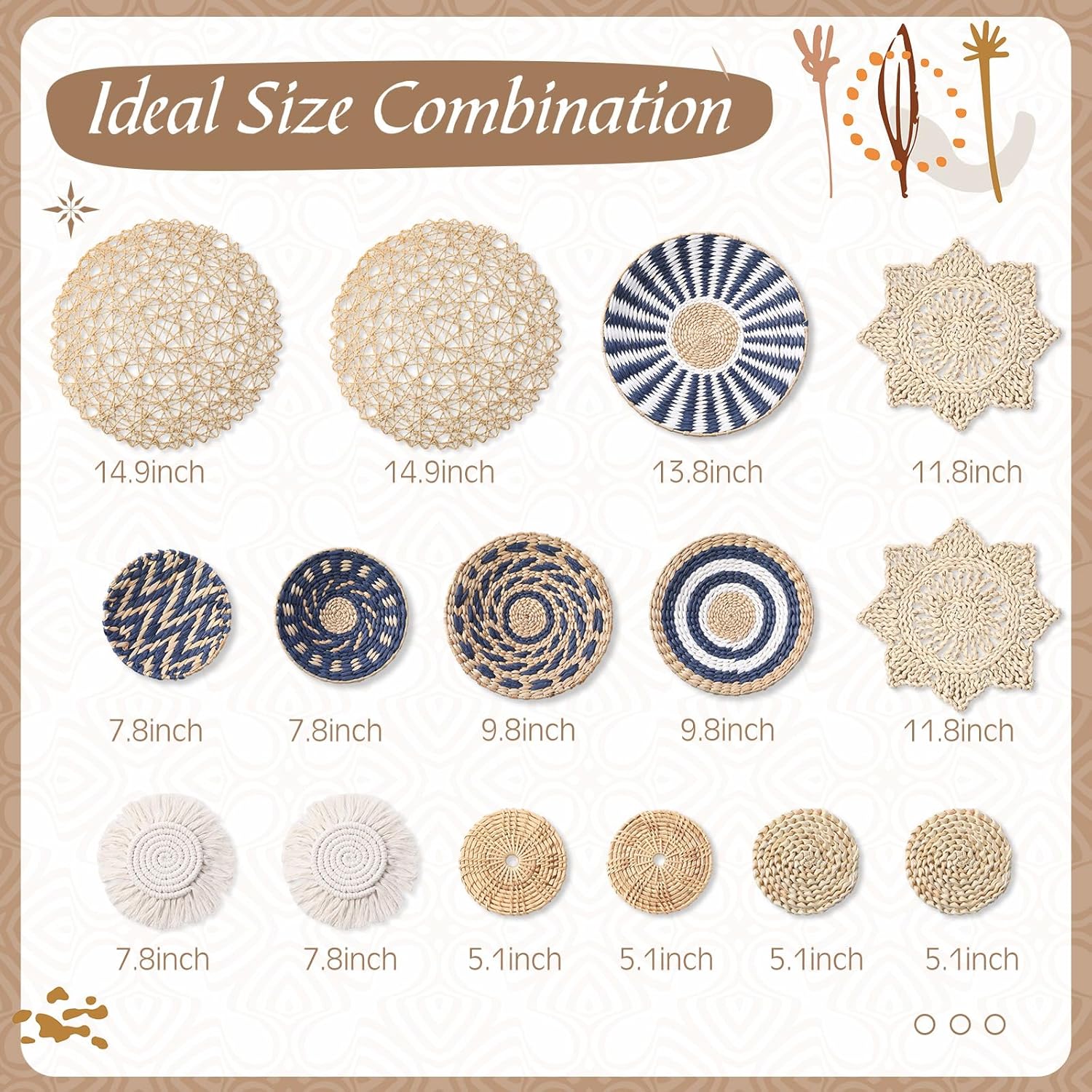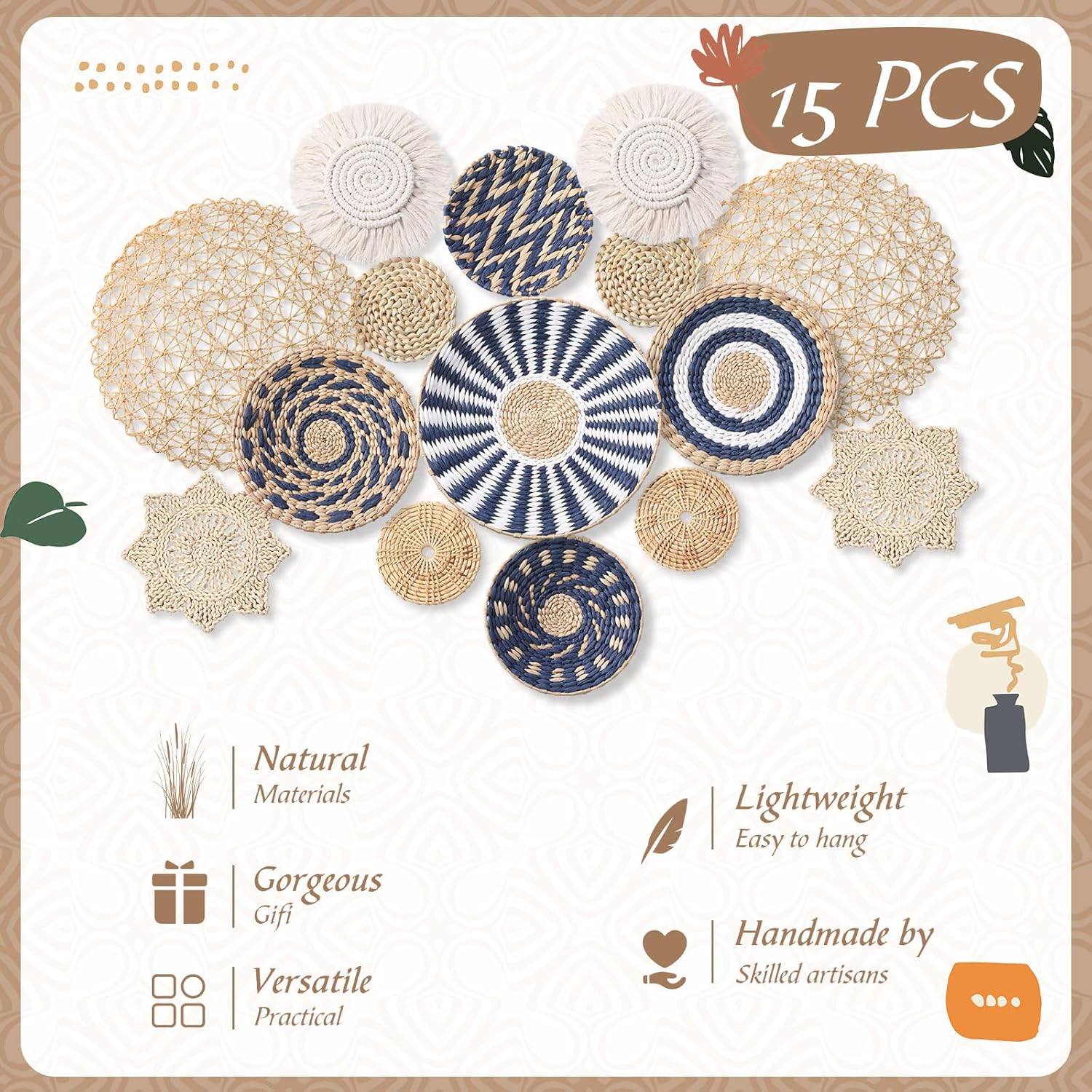 15 Pcs Boho Wall Basket Decor Woven Rattan Seagrass Wall Decor Hanging Rustic Farmhouse Western Art Decoration for Nursery Living Room Bedroom Home Kitchen(Blue Style)