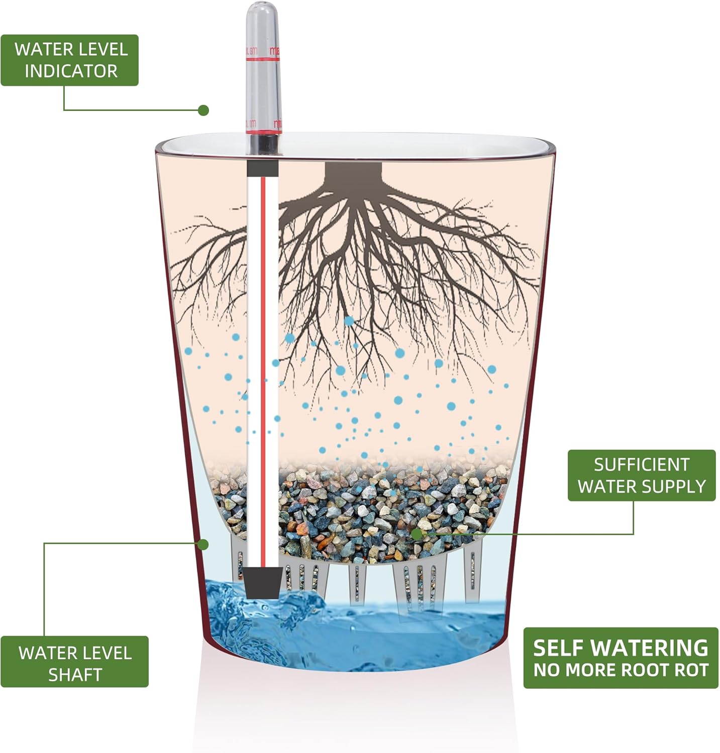 - NEVER MISS WATERING AGAIN - The hydroponic device keeps water ready, then watering time is at your discretion on the gauge. The design of drainage plug and spillway hole is to avoid cycles of overwatering and underwatering, pull out the plug to drain the excess water on rainy days outdoors. The sufficient water supply system enables double the water-efficient than conventional pots. Don't be anxious about missing watering while you enjoy a long term holiday on a journey or travel outside