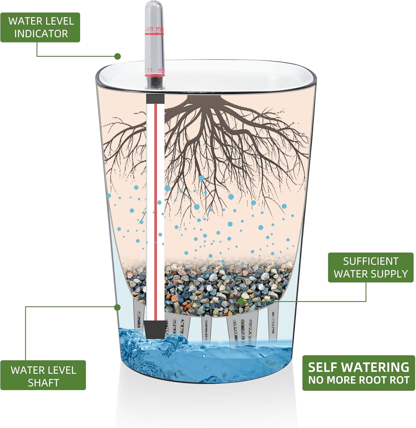 - SELF WATERING & NO MORE ROOT ROT - The smart unique sub-irrigation system is one of the most appealing aspects among all Dexceder planters. The easy-to-use separated integrated water reservoir or catcher- keeps your soil well aerated and automatic supplies plants with the right amount of ongoing moist air & nutrition for optimal growth. The insert indicator shows you the exact time to water again. The full water supply period can single-handedly last over 3 weeks based on different live plants
