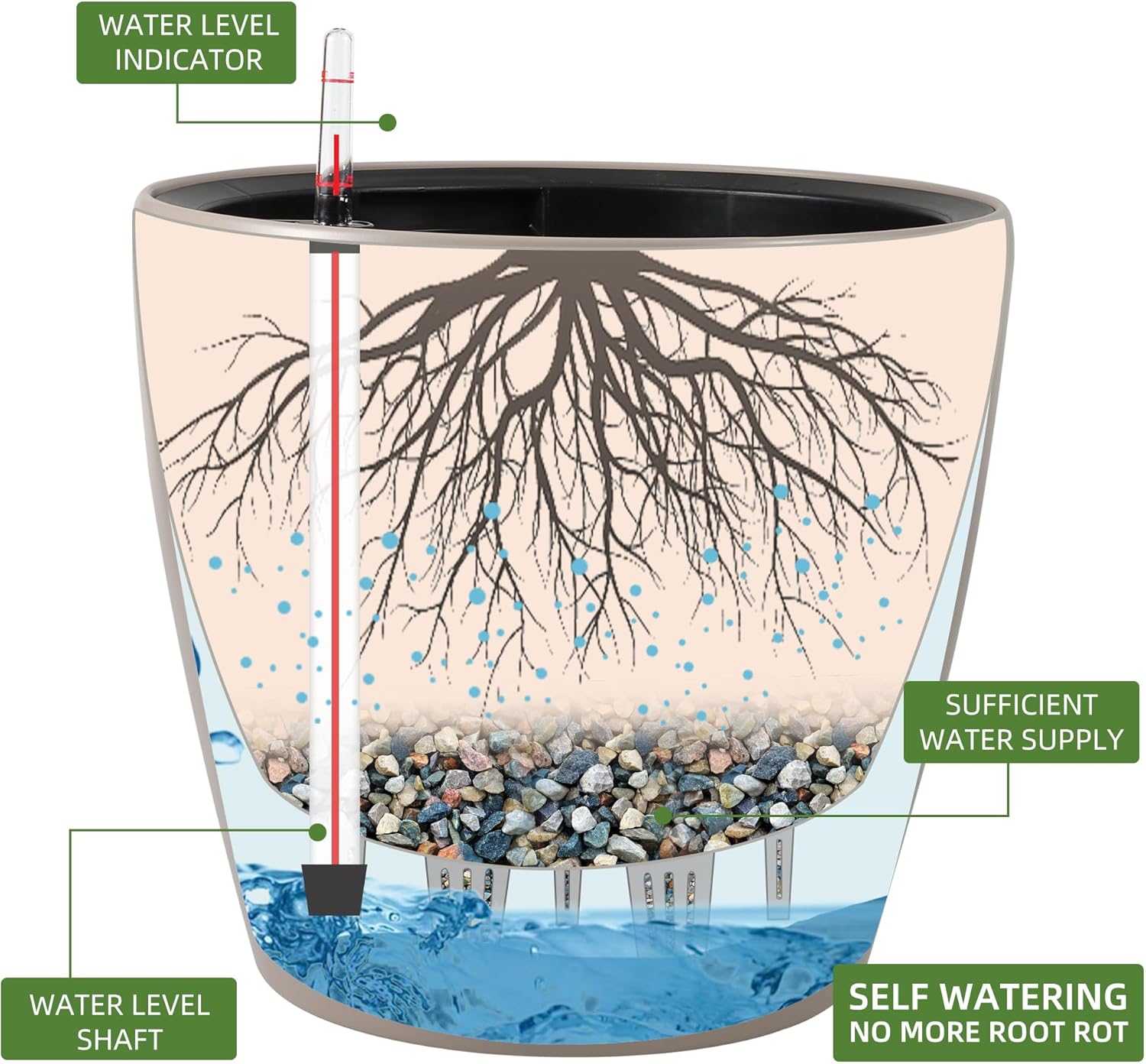 - NEVER MISS WATERING AGAIN - The hydroponic device keeps water ready, then watering time is at your discretion on the gauge. The design of drainage plug and spillway hole is to avoid cycles of overwatering and underwatering, pull out the plug to drain the excess water on rainy days outdoors. The sufficient water supply system enables double the water-efficient than conventional pots. Don't be anxious about missing watering while you enjoy a long term holiday on a journey or travel outside