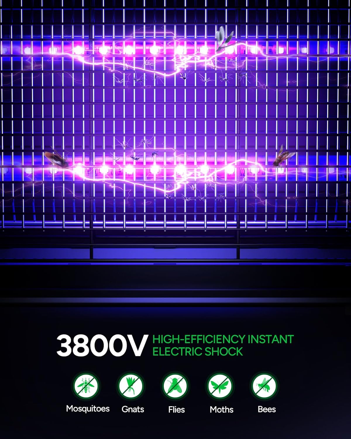 - High-Efficiency Energy-Saving LED Tubes: Our bug zappers use 5W low-energy consumption LED tubes, boasting a long lifespan of up to 10 years. It can effectively attract a wide variety of insects, including mosquitoes, gnats, flies, and moths, to quickly hit them with high-voltage electricity.
